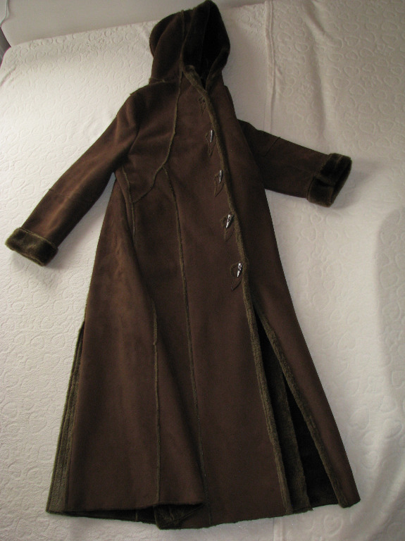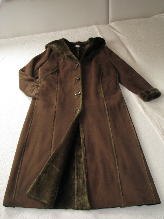 Sprzedam ciepły, dobrej jakości kożuszek damski z kapturem w rozmiarze XXL, wykonany z przyjemnej, miłej w dotyku skóry ekologicznej, w kolorze ciepłego, czekoladowego brązu.
