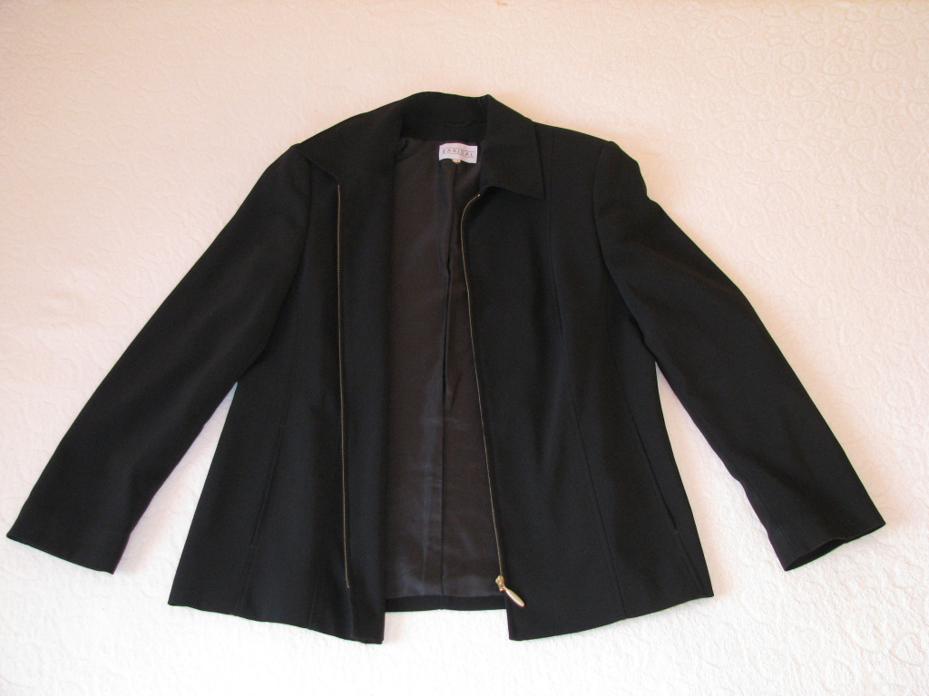 Marynarka zapinana jest na zamek w złotym kolorze, z przodu ma 2 wsuwane, ukryte w szwie. kieszenie, od spodu wykończona jest podszewką.
