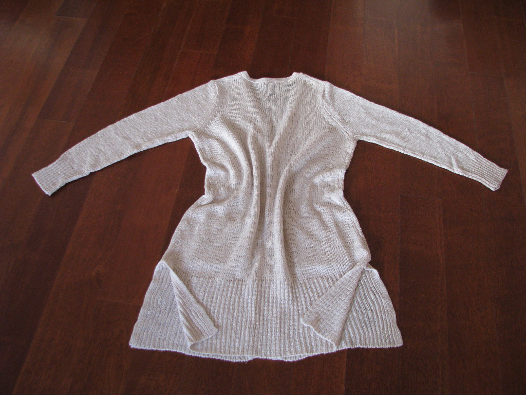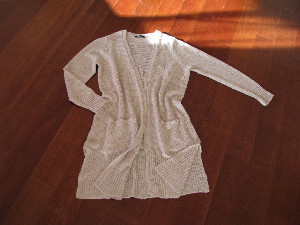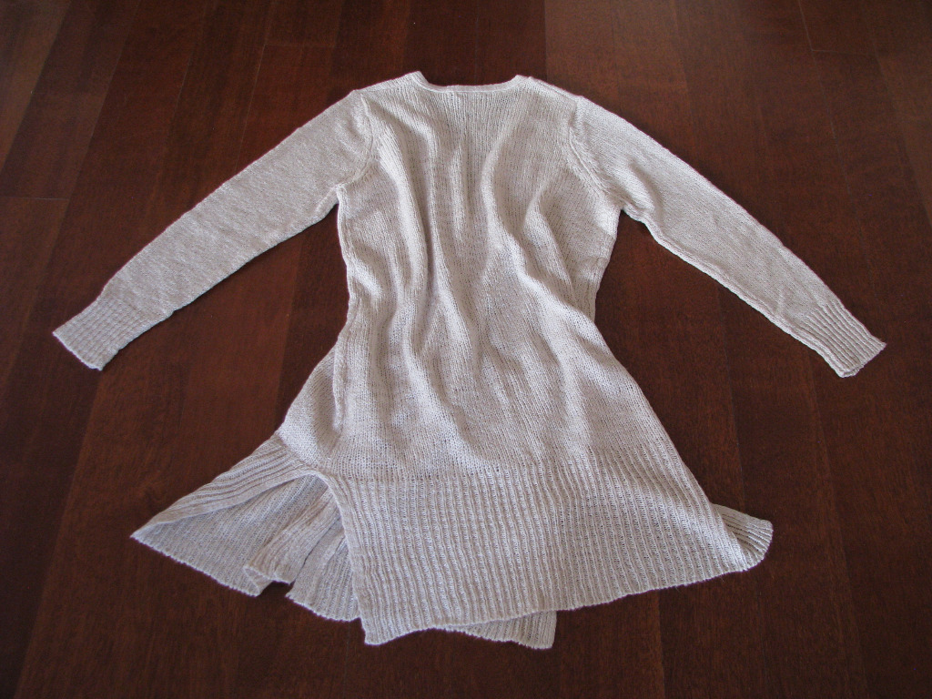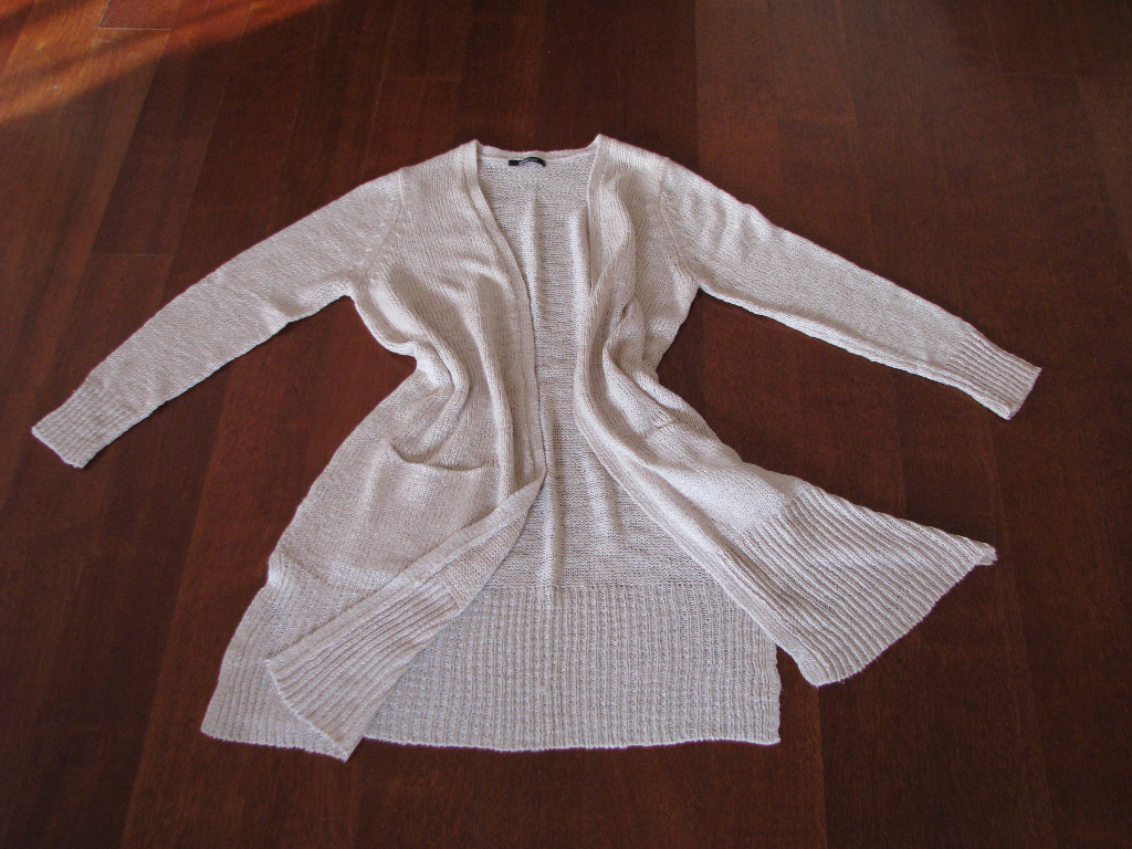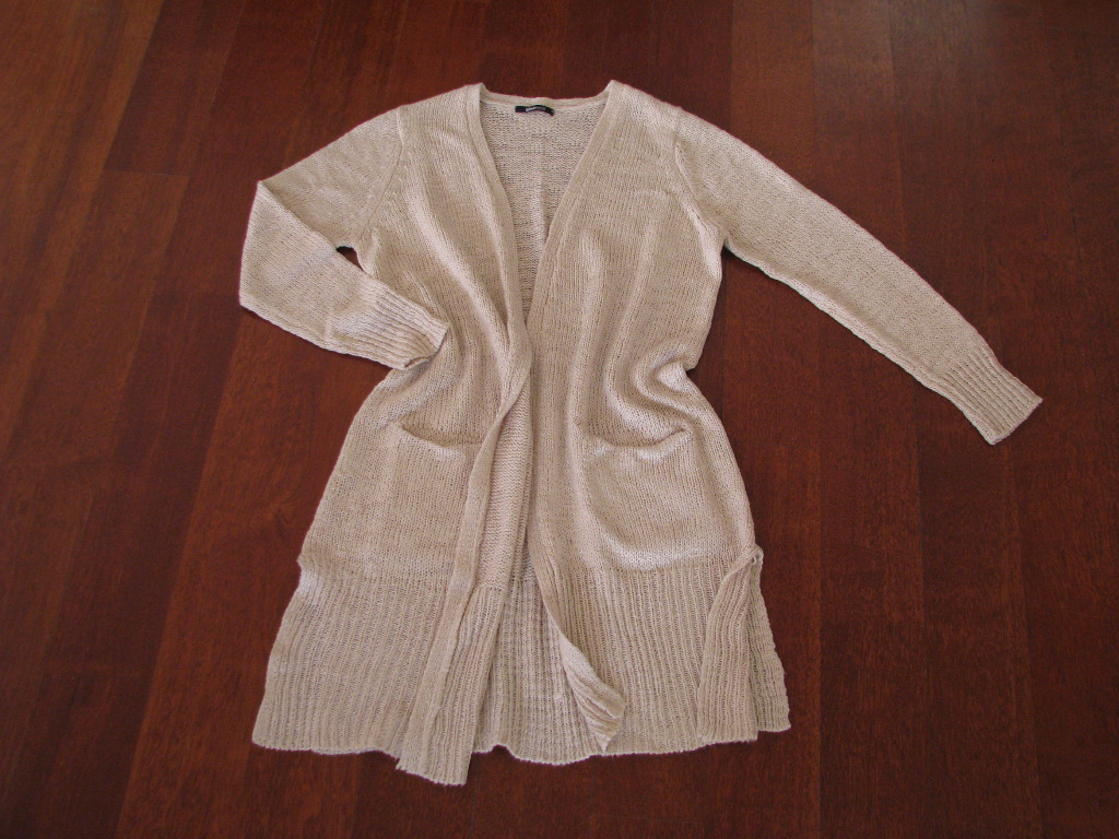 Sweterek bez zapięcia, ma proste długie rękawy, na wysokości bioder 2 wpuszczane kieszenie i rozporki po bokach, tył jest gładki.