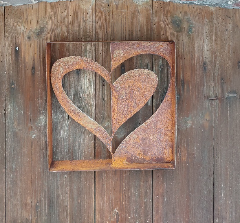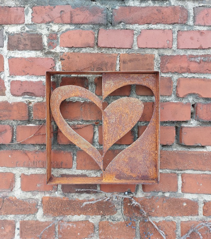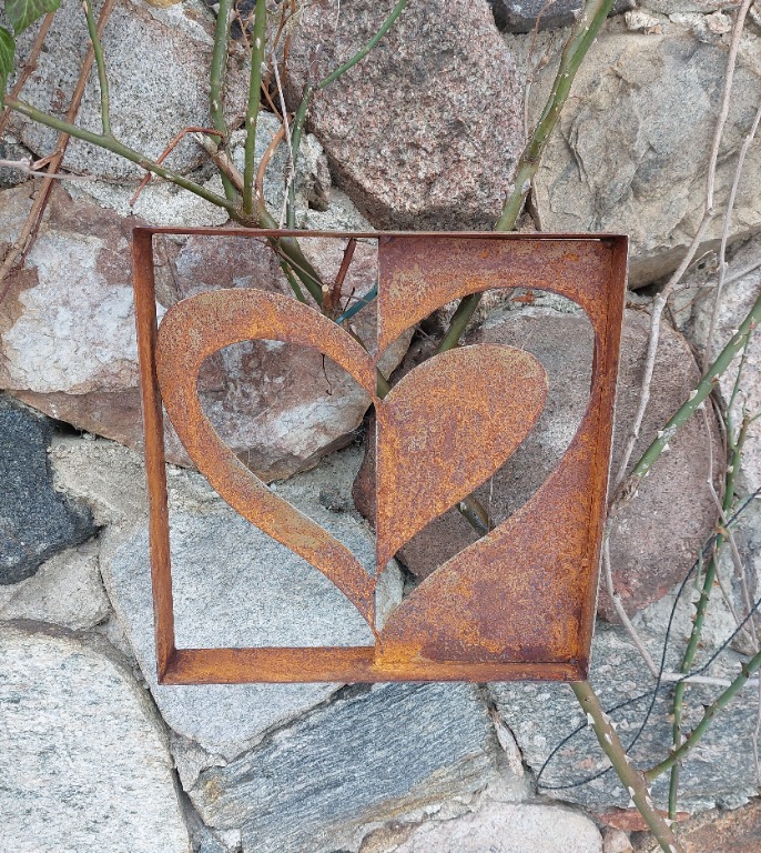 Oferuję uroczą ręcznie wykonaną dekoracje metalowe, naturalnie rdzewioną, która oryginalnie ozdobi ogród-taras. Wymiary: - wysokość 36cm. - szerokość 36cm.