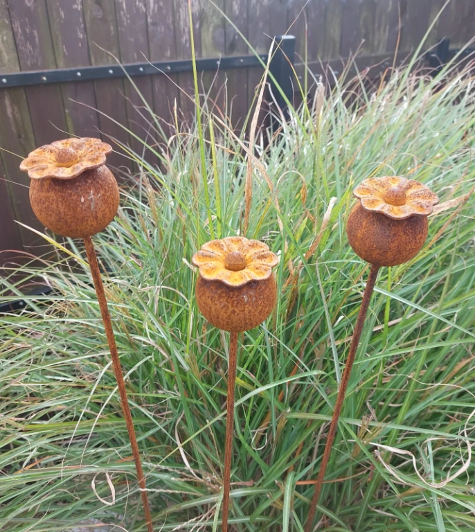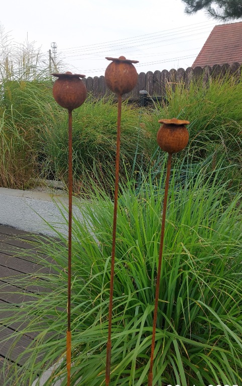 Oferuję uroczą ręcznie wykonaną dekoracje metalowe w formie makówek,naturalnie rdzewione, które oryginalnie ozdobią ogród-taras. Zestaw 3szt. Wymiary: - wysokość 110cm. - szerokość 6cm.