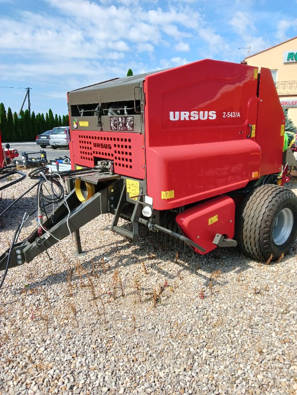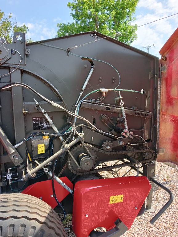 Prasa łańcuchowa z 1 walcem wyrzucającym bele. Wyposażenie: obwiązywacz siatką, sznurkiem, centralne smarowanie