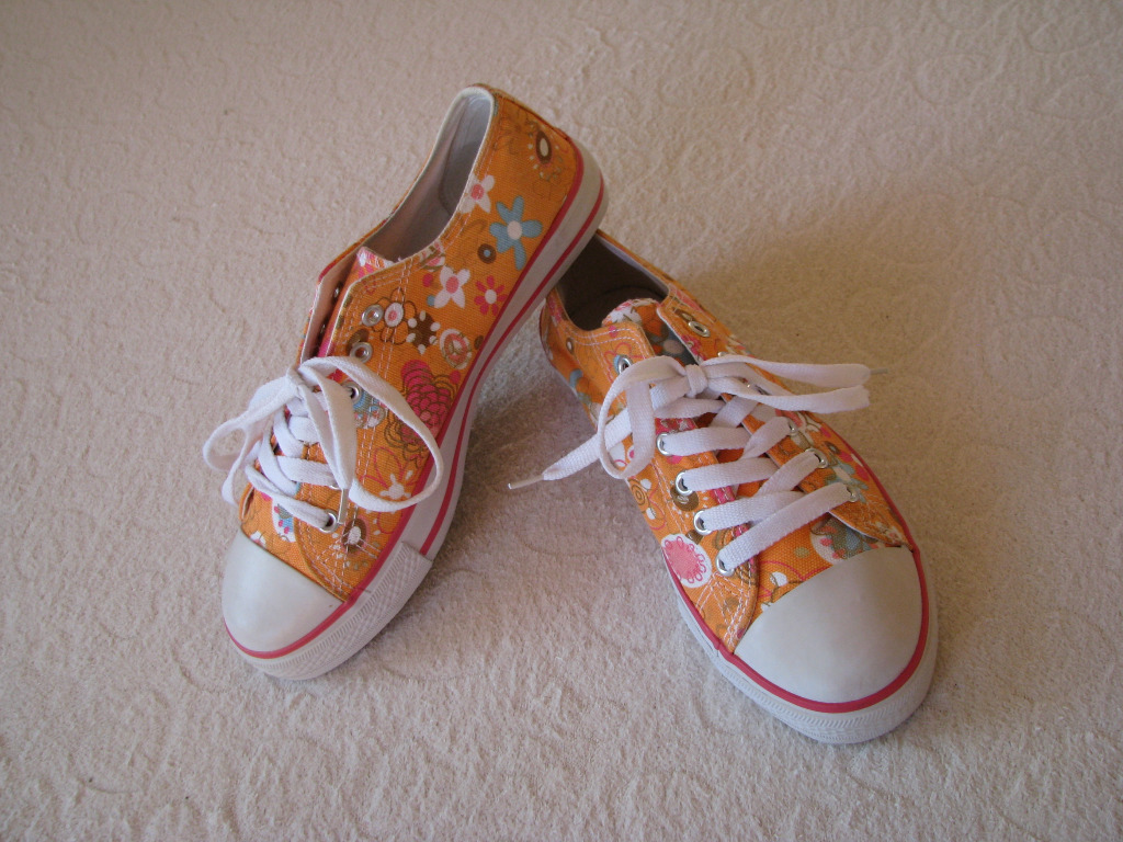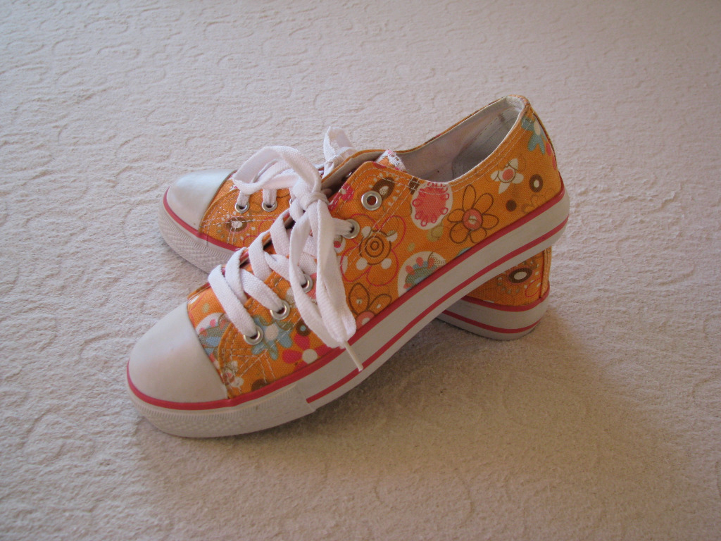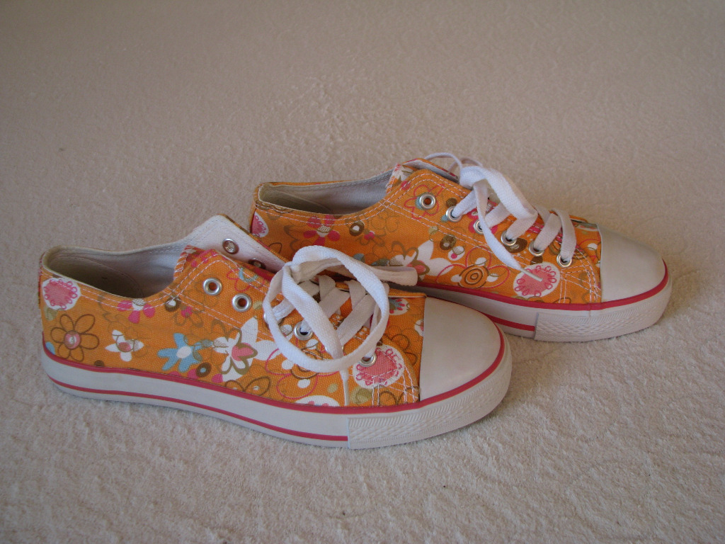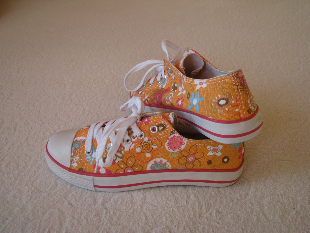 Obuwie wykonane z mocnej tkaniny bawełnianej w żywych wiosenno-letnich kolorach - kolor główny pomarańczowy w kolorowy, kwiecisty wzór.
