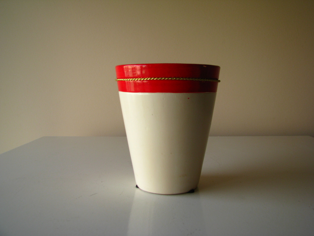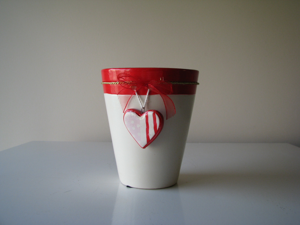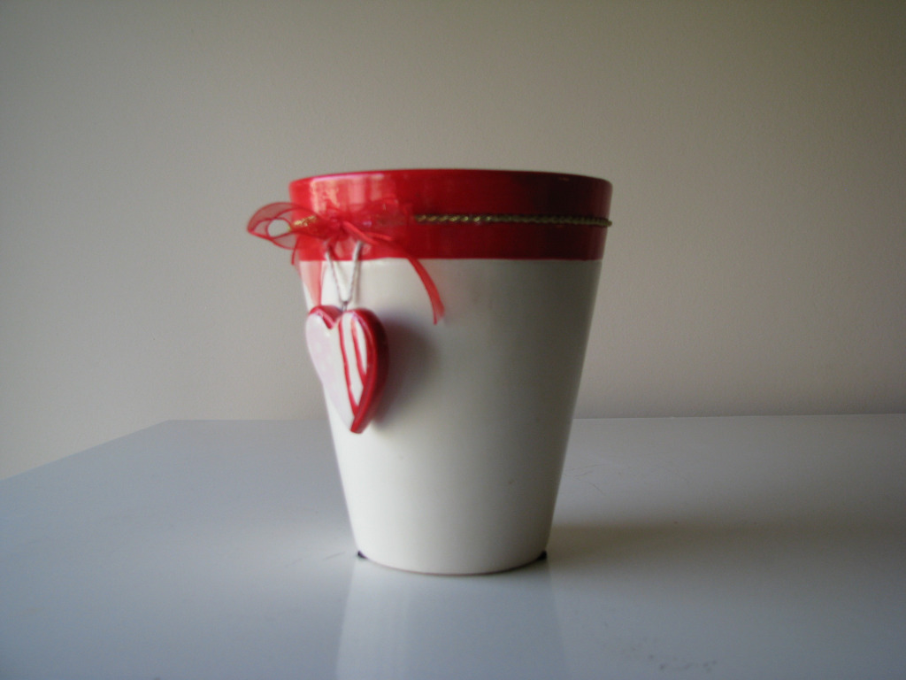Sprzedam urocze, ceramiczne naczynko - osłonkę na doniczkę z serduszkiem w kolorze ecru i czerwonym, ozdobioną złotym sznureczkiem i ceramicznym serduszkiem z szyfonową kokardką.