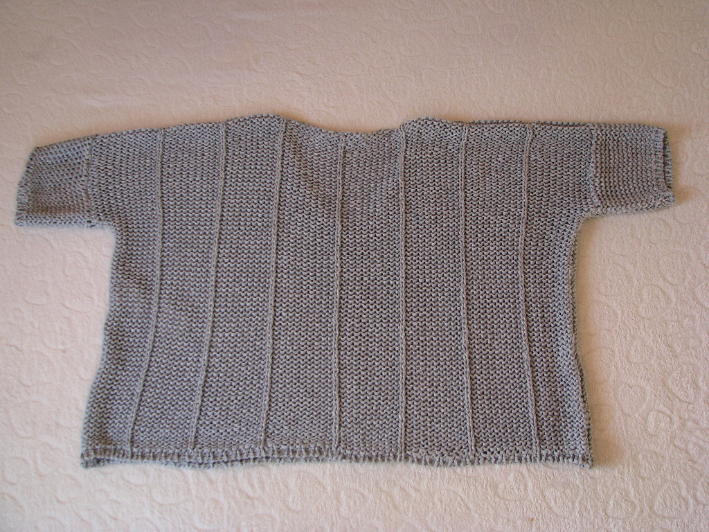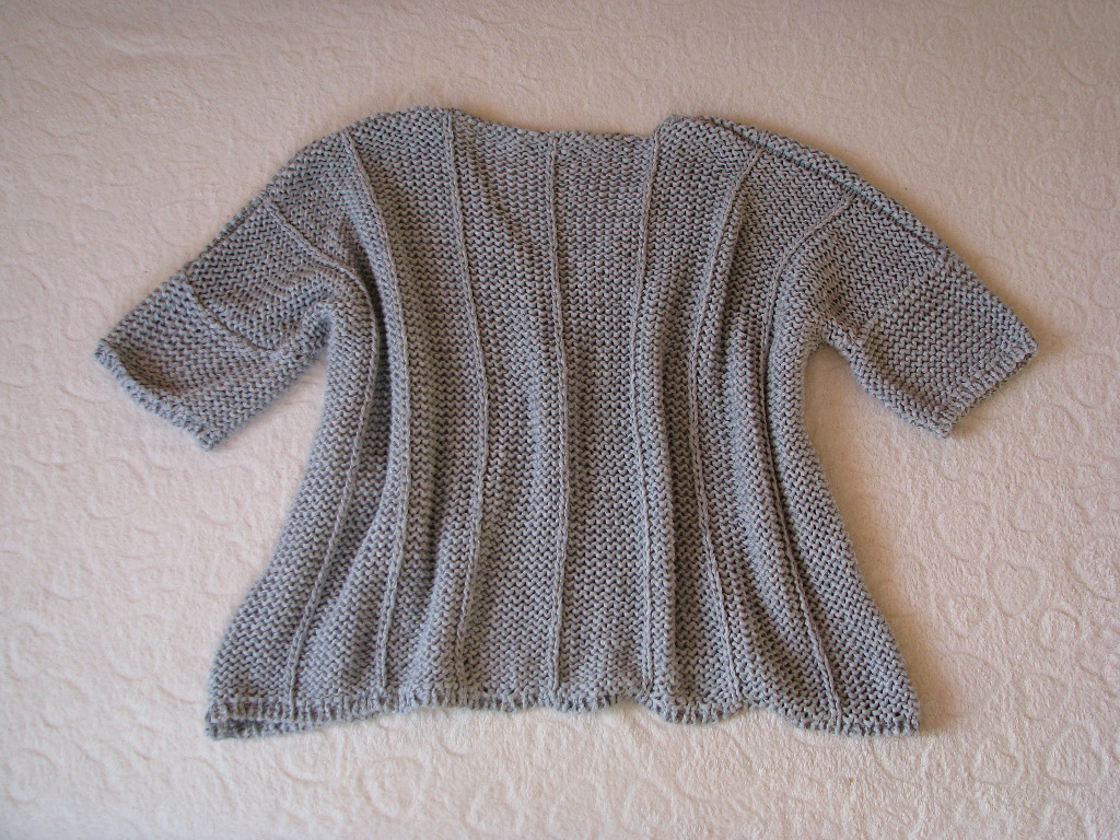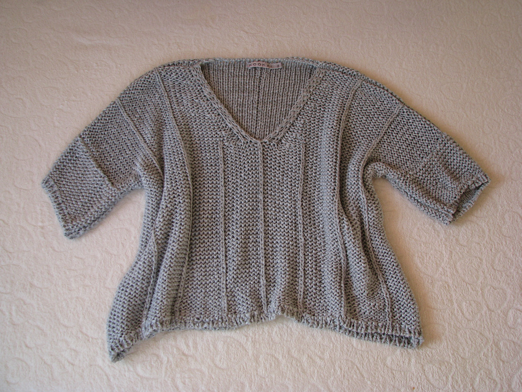 Sweterek wkładany jest przez głowę, wykończenie pod szyją w szerokie V, rękawy po założeniu ¾.