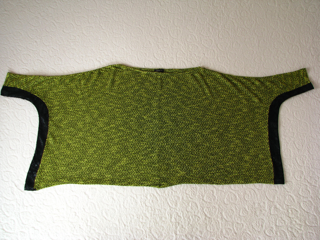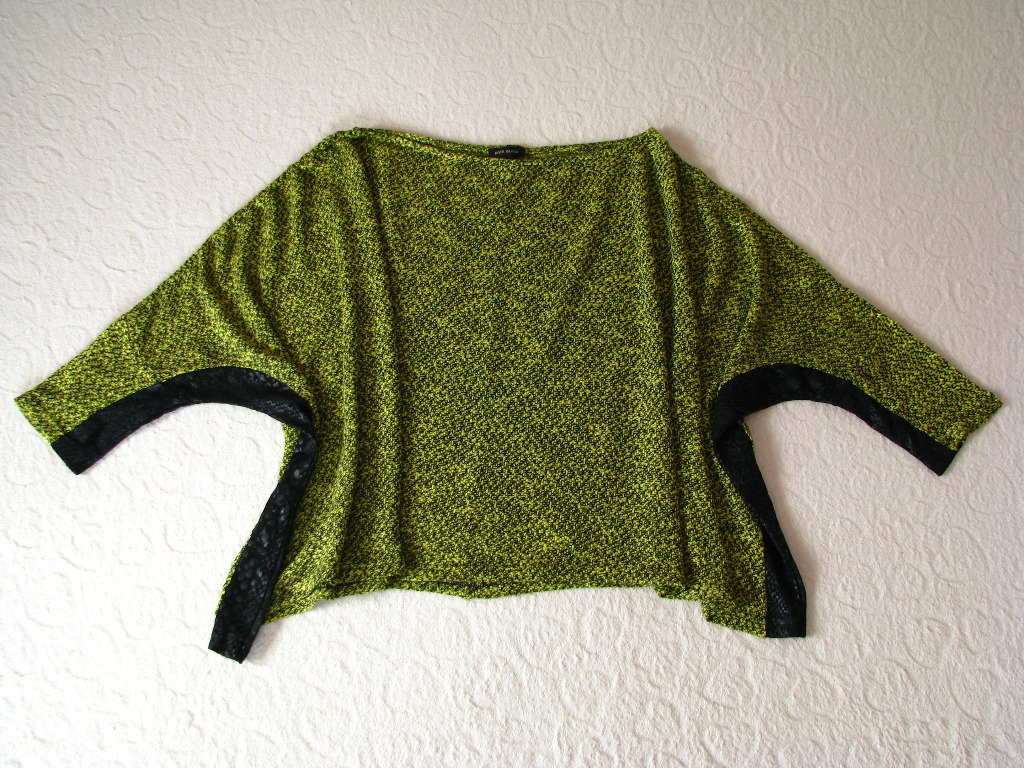 Sweterek zakładany jest przez głowę, wykończenie pod szyją w szeroką „łódkę”, rękawy po założeniu ¾, boczne szwy i wewnętrzna strona rękawa wykończona jest ozdobnym, czarnym materiałem nadającym całości charakteru.