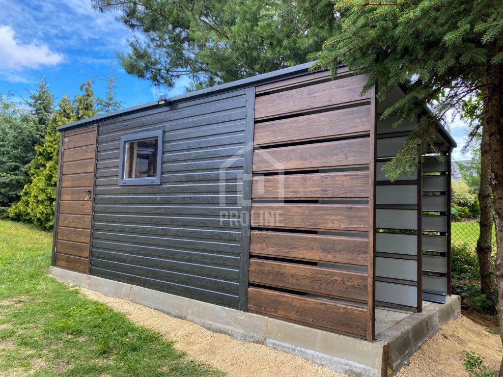 Schowek - Domek ogrodowy 4x2m -wiata 1m - okno - ciemny orzech - drewnopodobny - sosna norweska - dach spad w tył PLG190