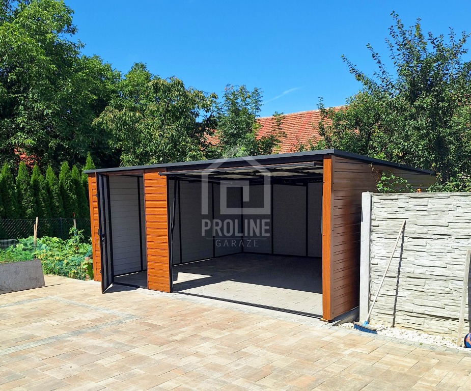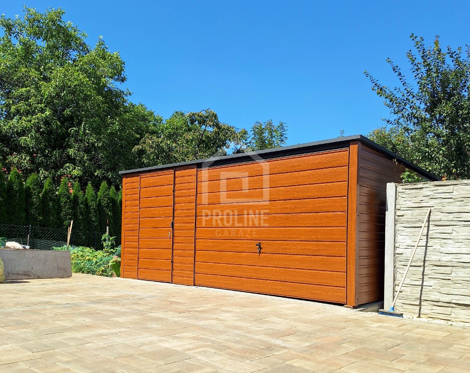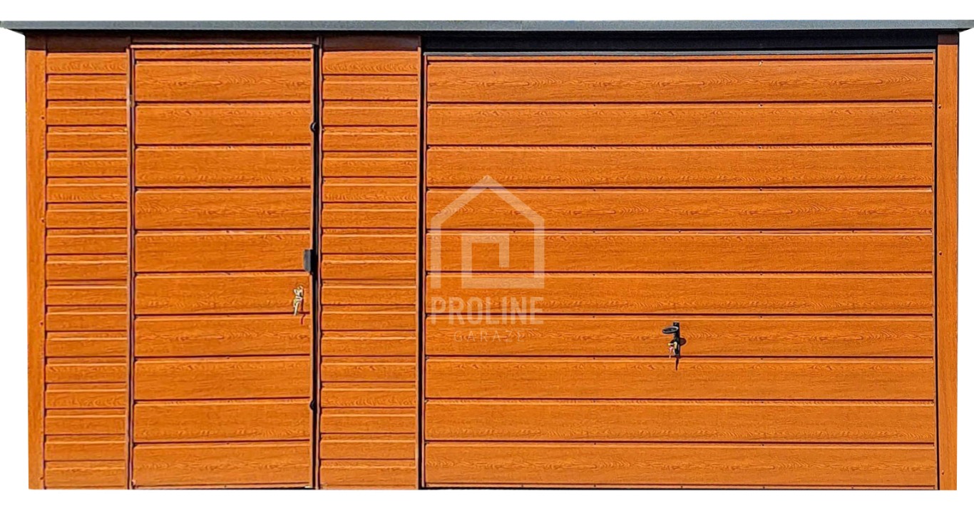 Garaż blaszany 5x6m - Brama uchylna - drzwi - drewnopodobny złoty dąb - Dach spad w tył PLG198