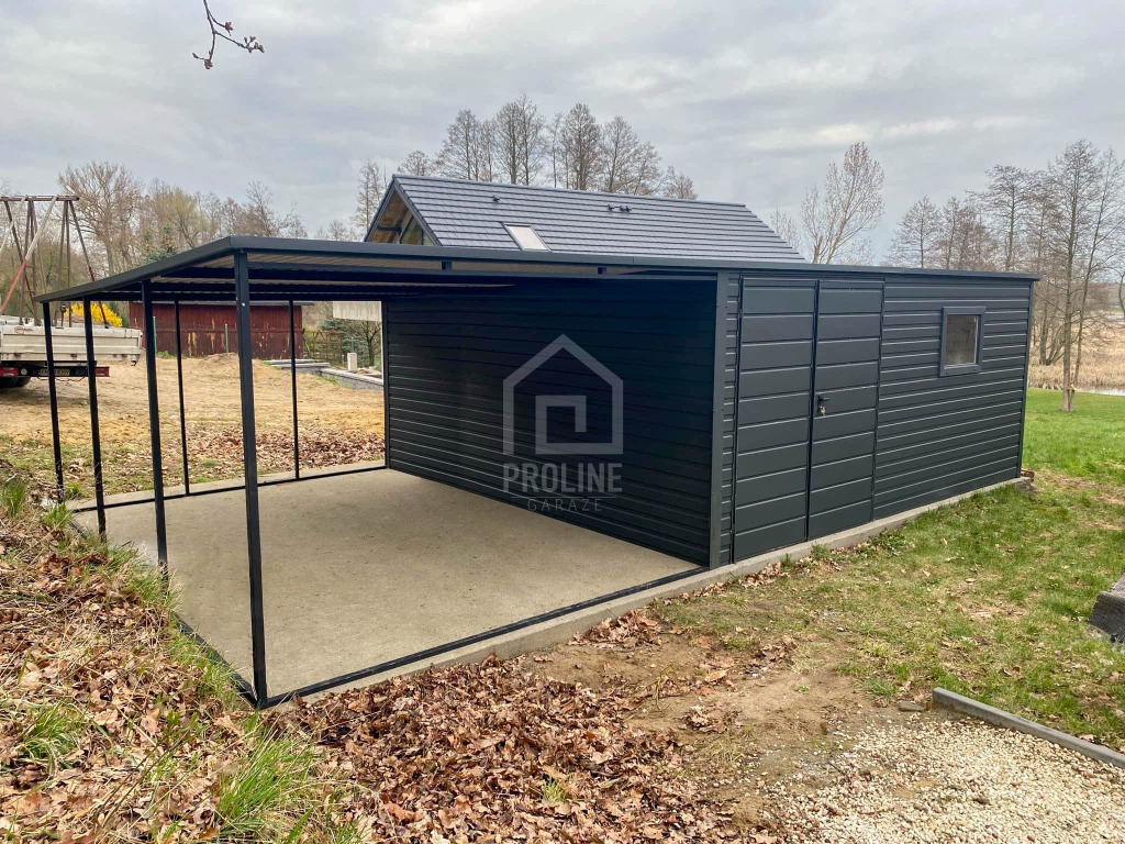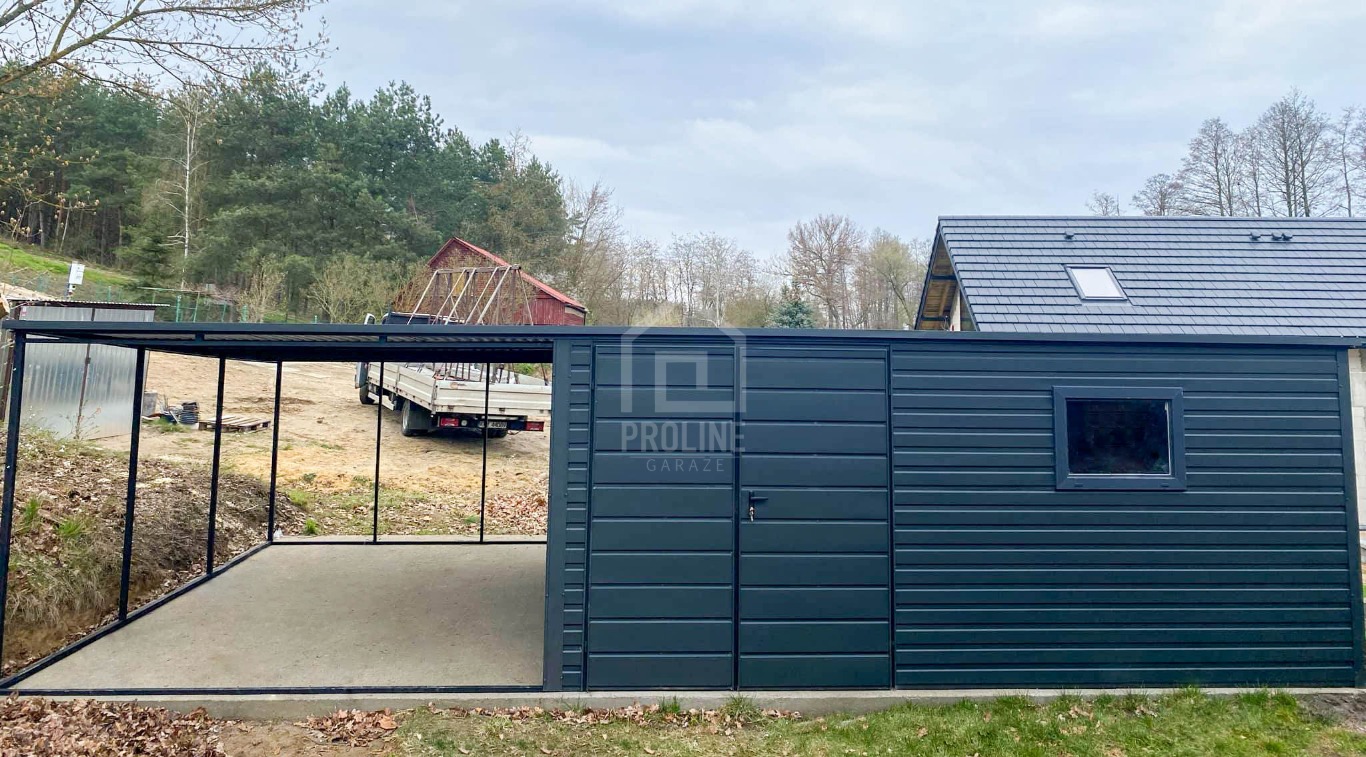 Garaż Blaszany 5x4m + Wiata 4m - Brama dwuskrzydłowa - Okno - Antracyt - dach spad w tył PLG200