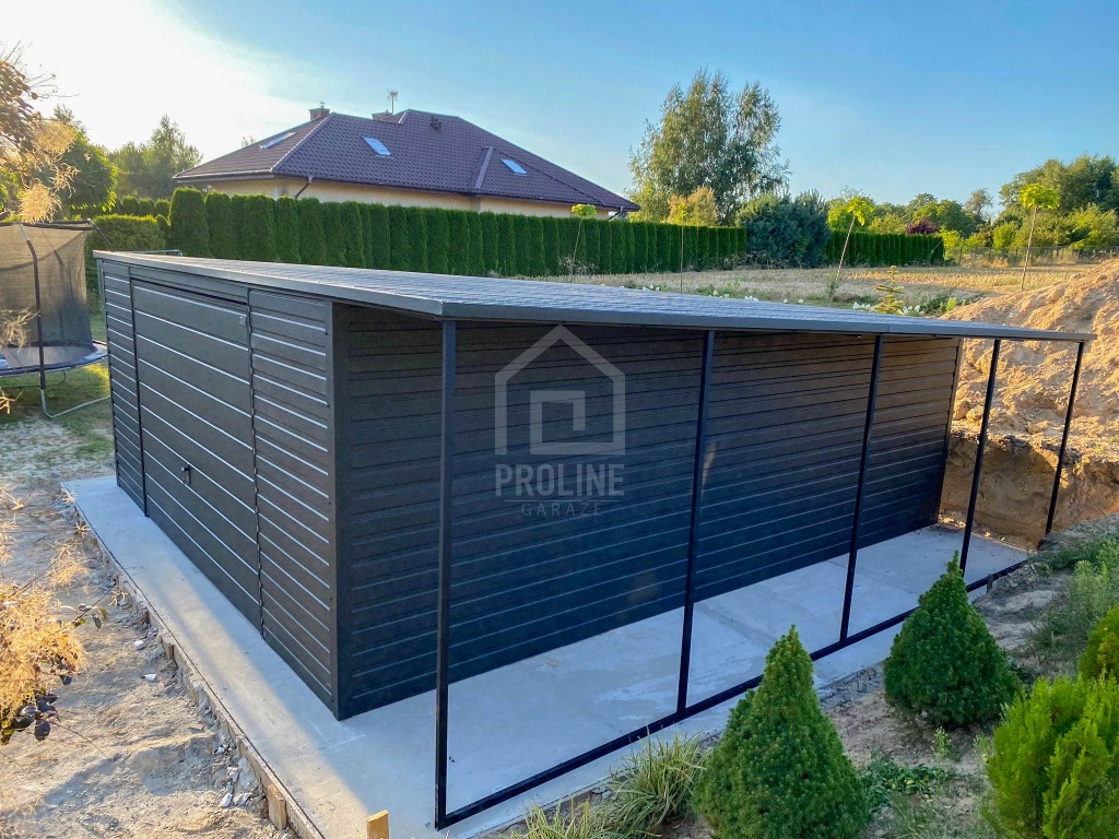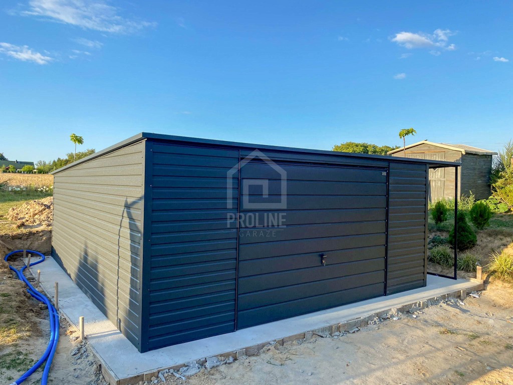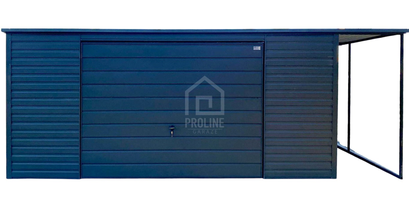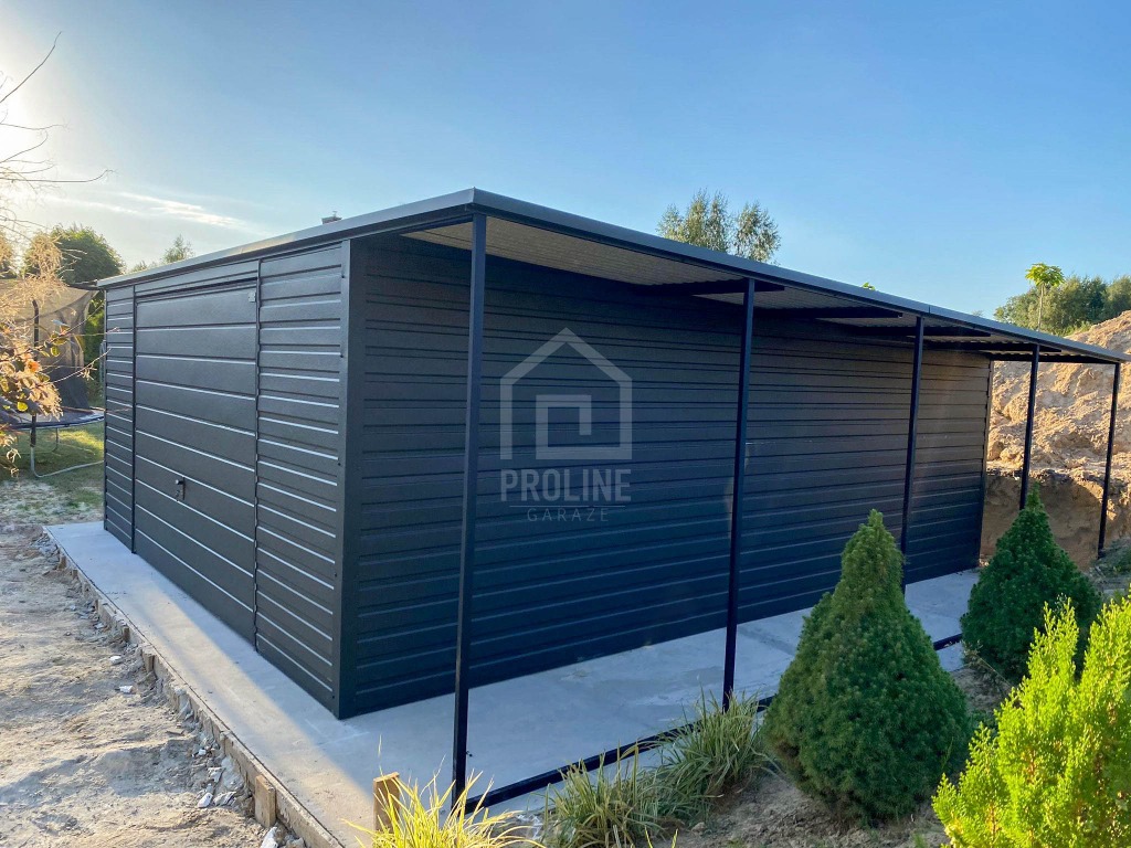 Garaż blaszany 5x6m - wiata 1m - brama - antracyt - dach spad w tył PLG204