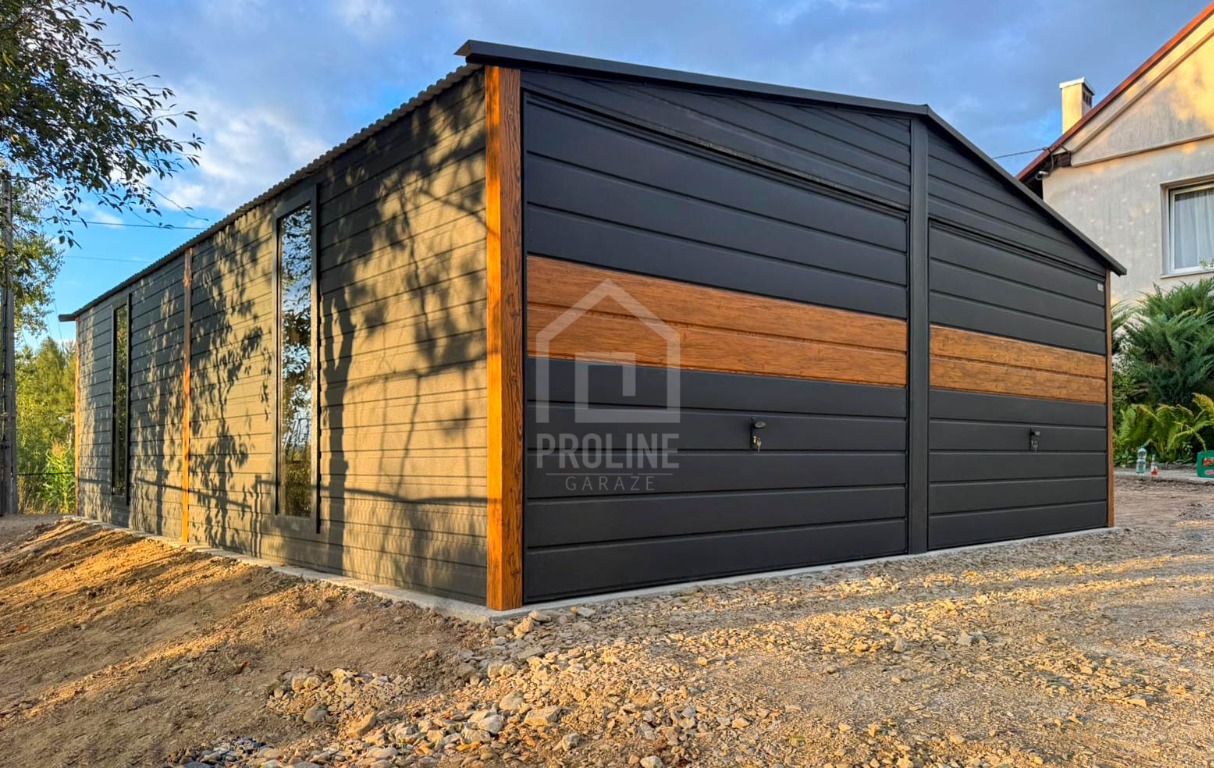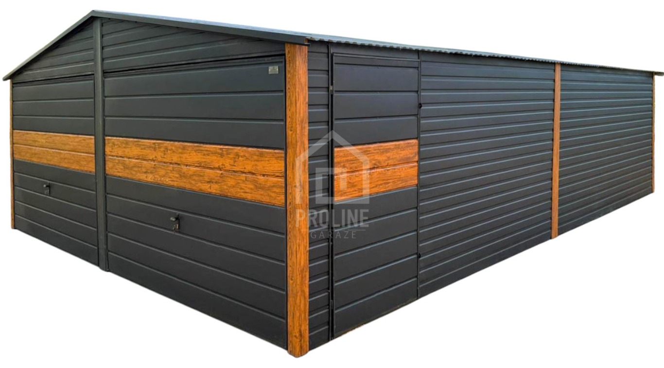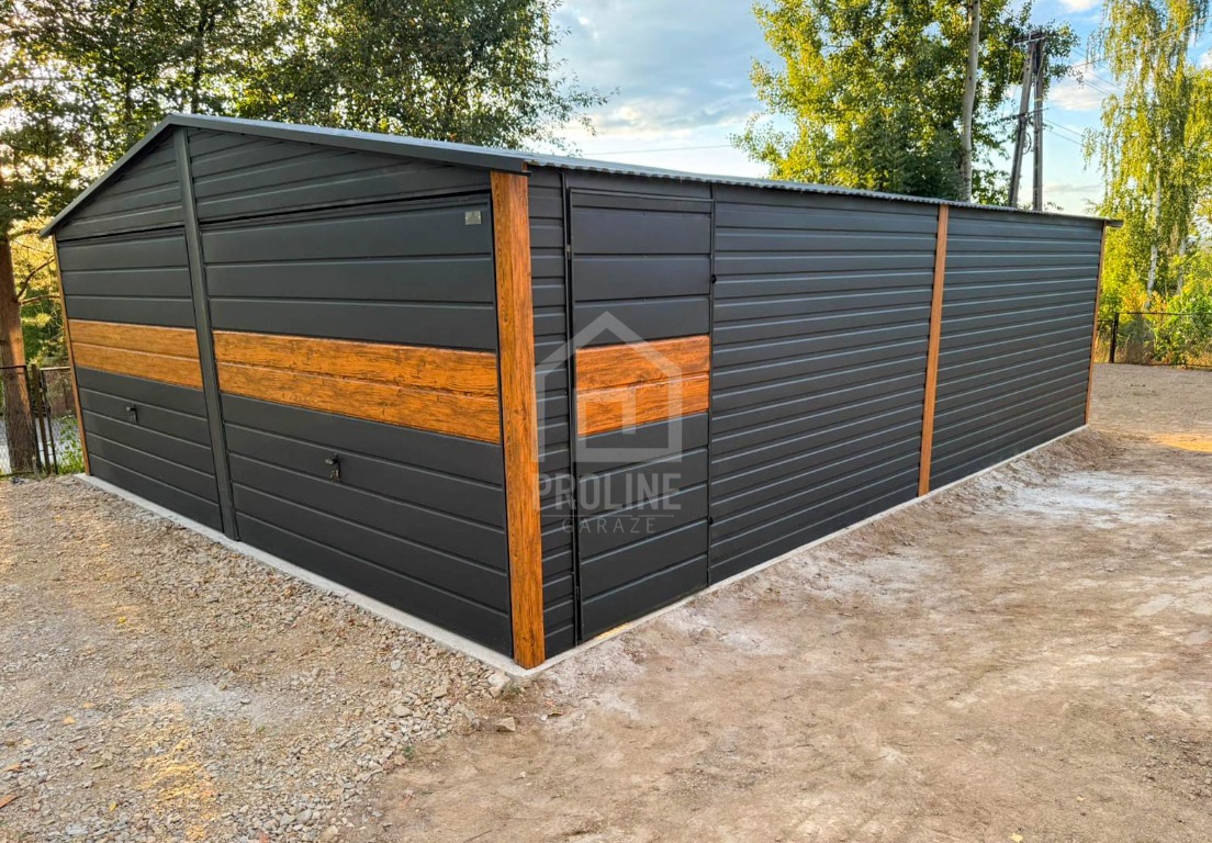 Garaż blaszany 6x6m - 2x brama - drzwi - 2x okno - antracyt - jasny orzech - dach dwuspadowy PLG205