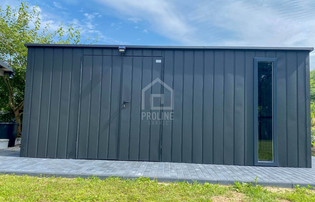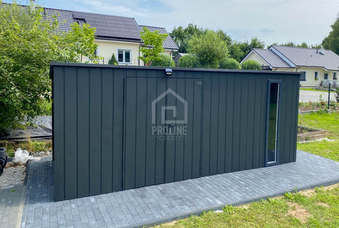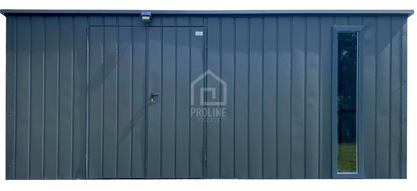 Schowek - domek ogrodowy 5x2m - wiata 0,5m - brama dwuskrzydłowa - okno - antracyt - dach spad w tył PLG207