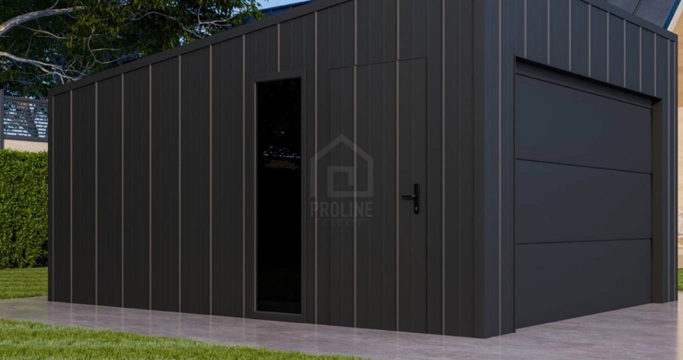 Garaż blaszany 4x6 - brama segmentowa - okno - drzwi - dach spad w tył - blacha na rąbek PLG210