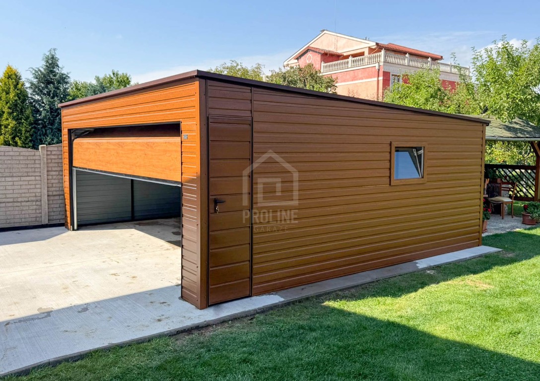 Garaż blaszany 6x5m - brama segmentowa - drzwi - okno -złoty dąb - drewnopodobny - dach spad w tył PLG232