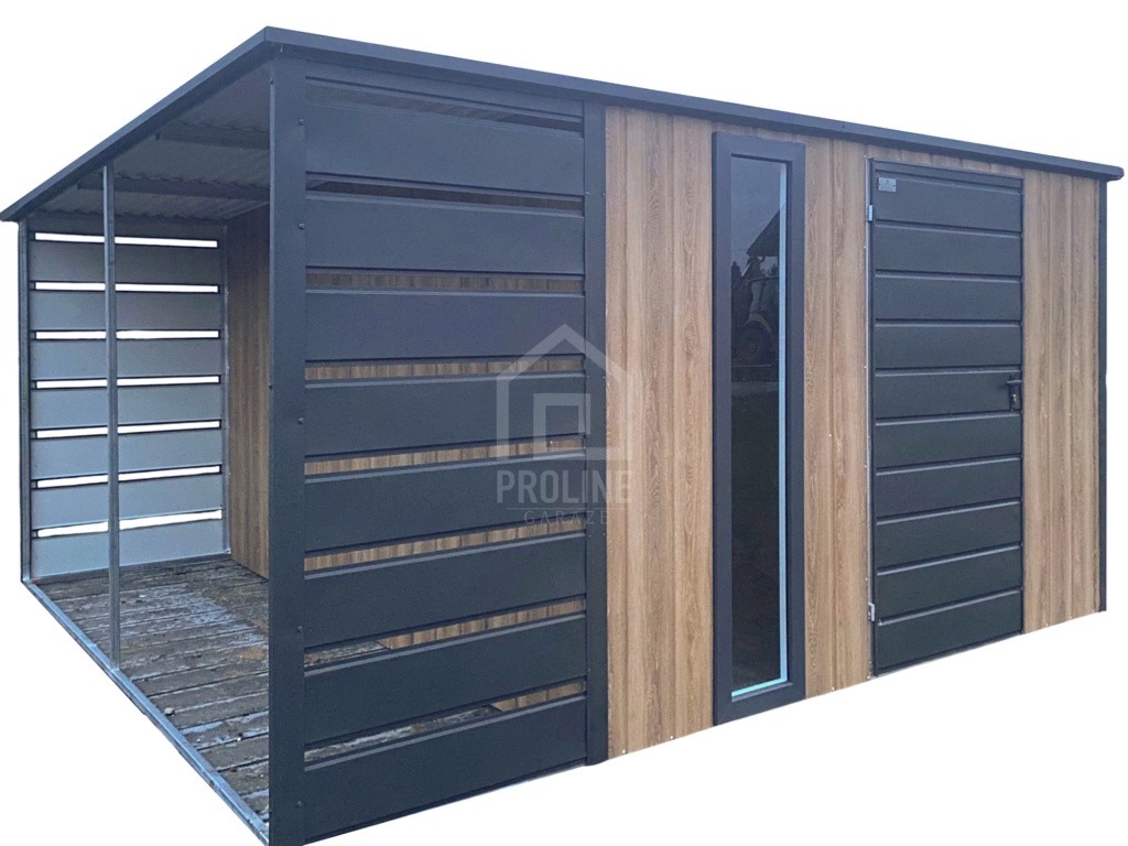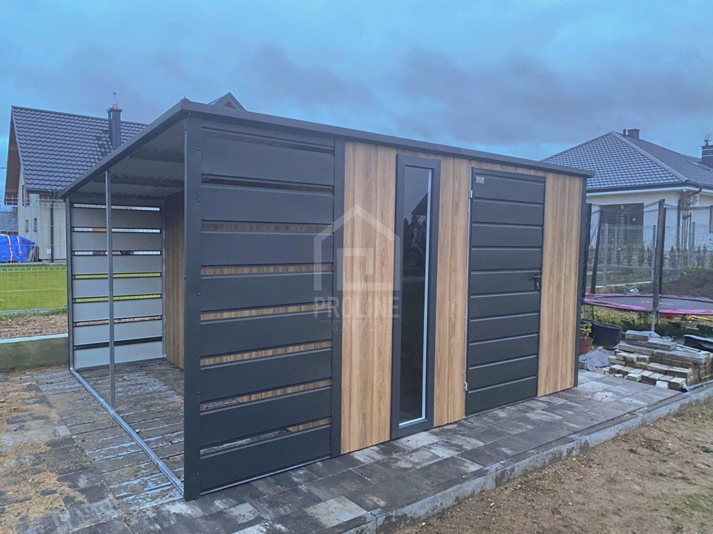 Schowek – domek ogrodowy 3×3 – wiata 1×3 – drzwi – okno – antracyt – dach spad w tył PLG233