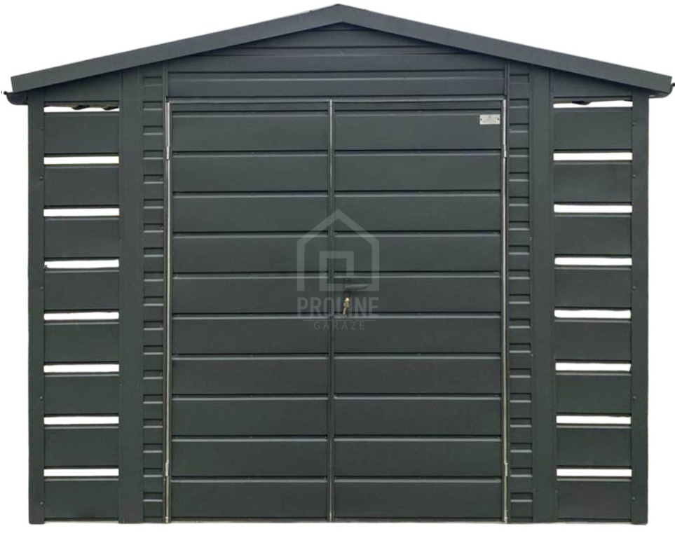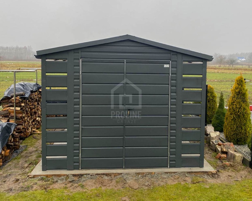 Domek ogrodowy - schowek - 2x3m – 2xwiata 0,5x3m - brama dwuskrzydłowa – antracyt - dach dwuspadowy - blachodachówka - rynny PLG235