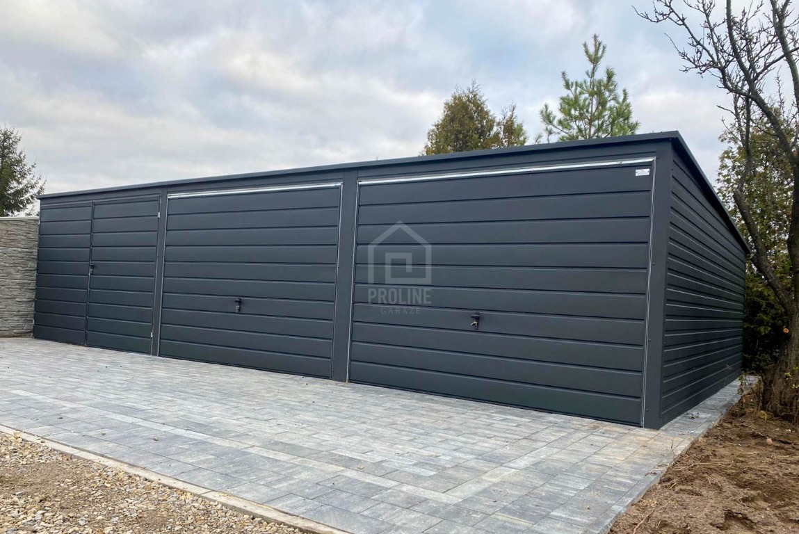 Garaż blaszany 9,4X5m – 2xbrama uchylna – brama dwuskrzydłowa - antracyt - spad w tył PLG241