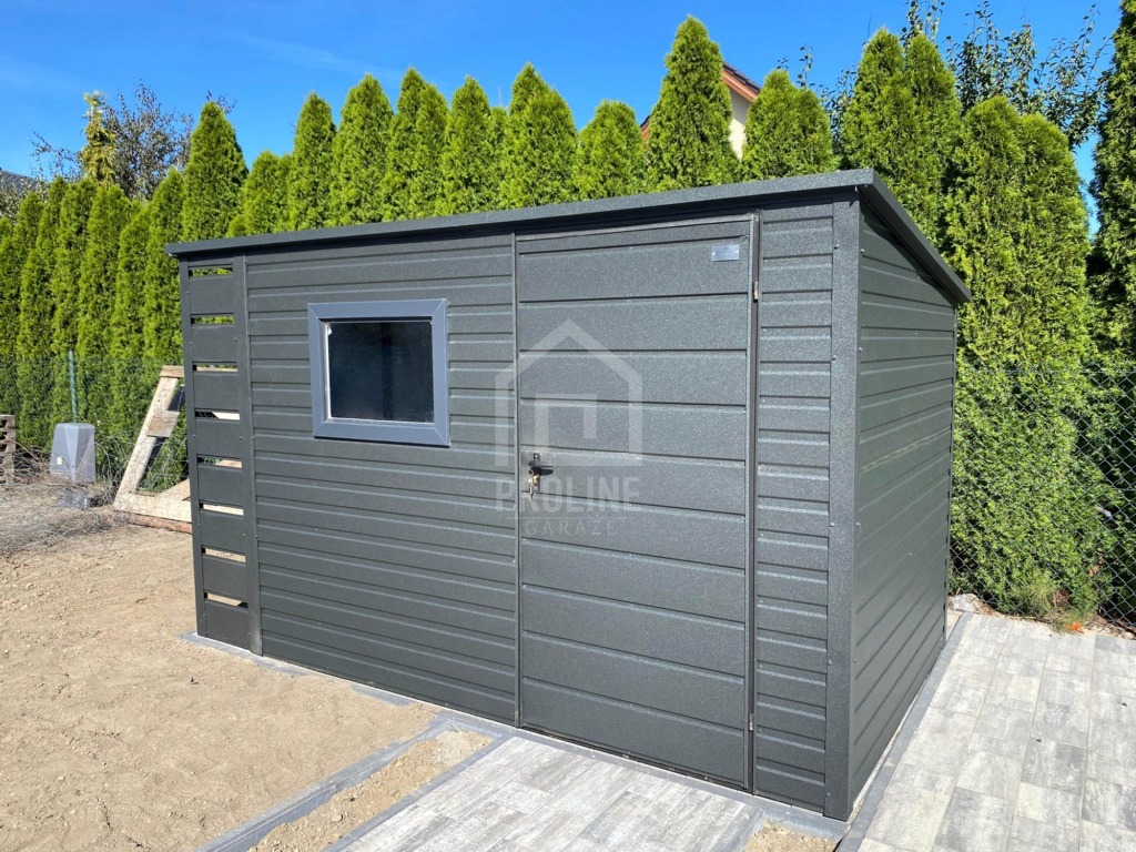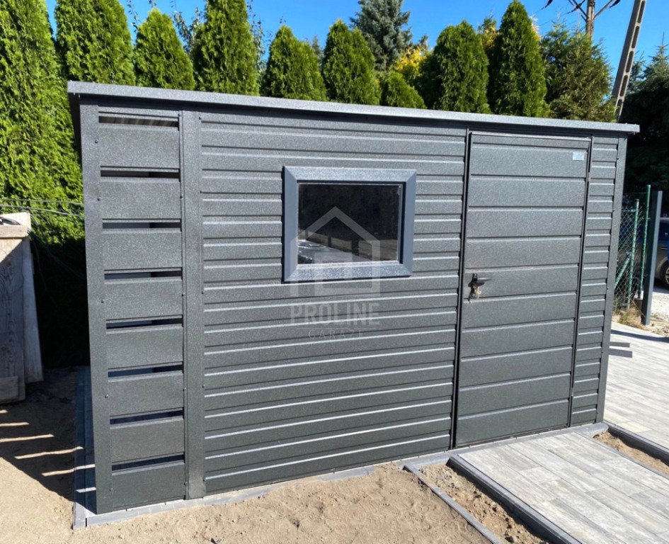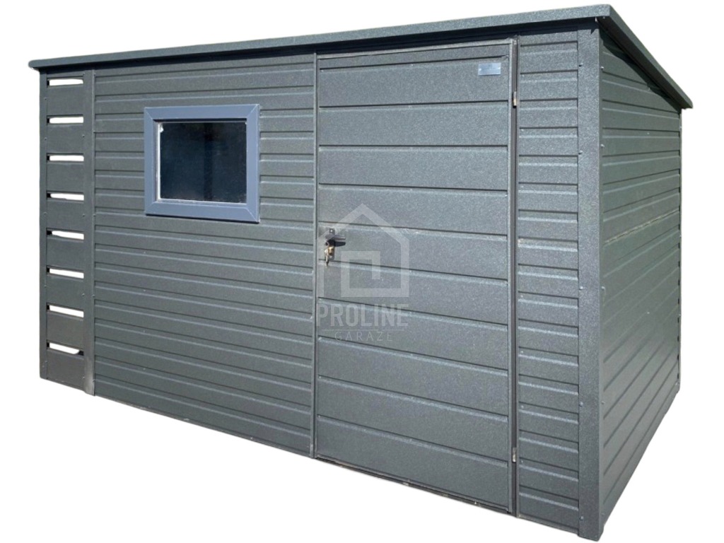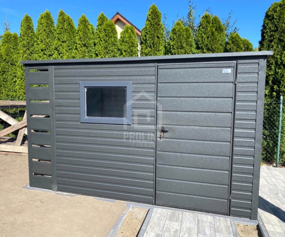 Schowek – domek ogrodowy 3×2 – wiata 0,4×2 – drzwi – okno – antracyt – dach spad w tył PLG247