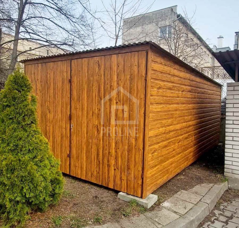 Garaż blaszany 3x5m - brama dwuskrzydłowa - jasny orzech - drewnopodobny - dach spad w tył PLG249