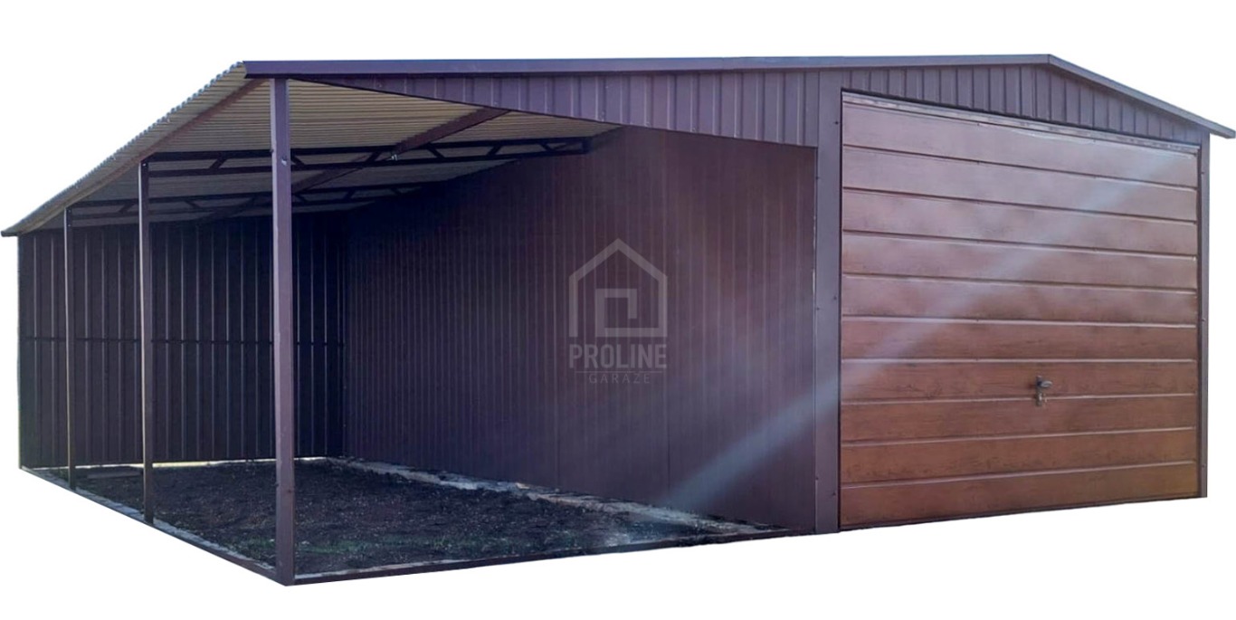 Garaż blaszany 3x6m + wiata 3m - brama uchylna - okno - ciemny brąz - dach dwuspadowy PLG250