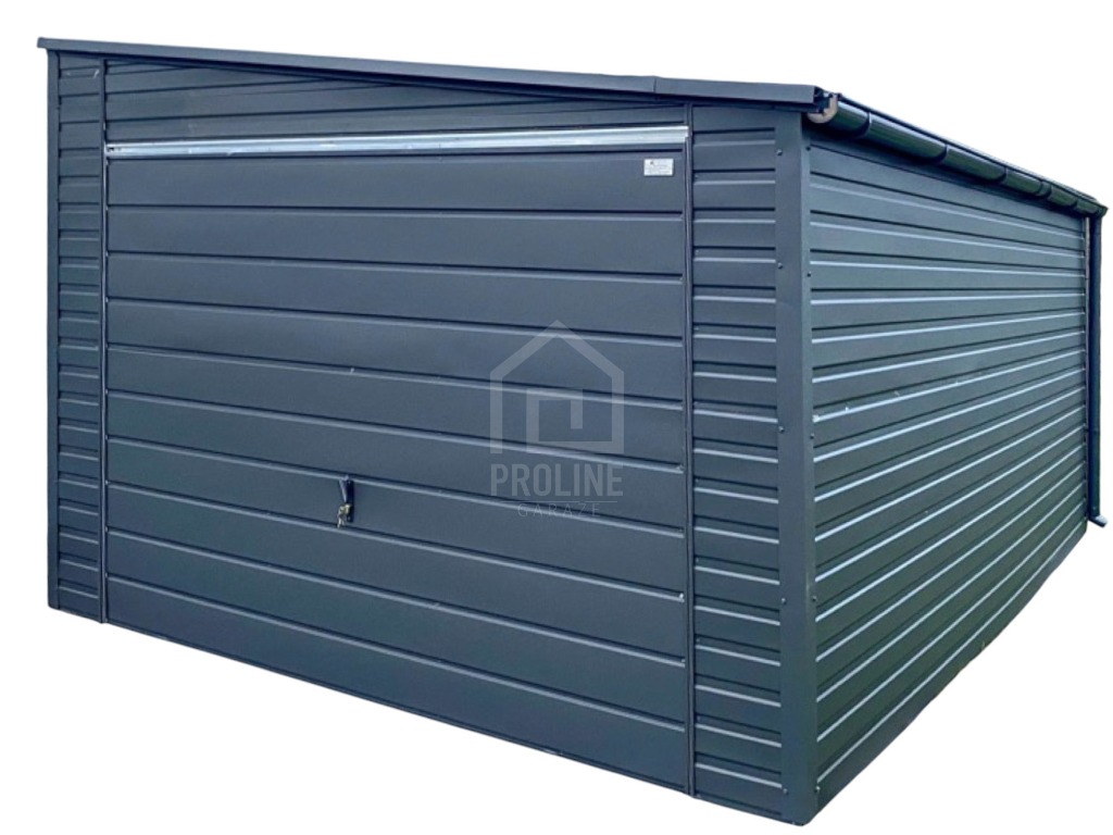 Garaż blaszany 4x5m - brama uchylna - antracyt - dach spad w bok - rynny PLG252