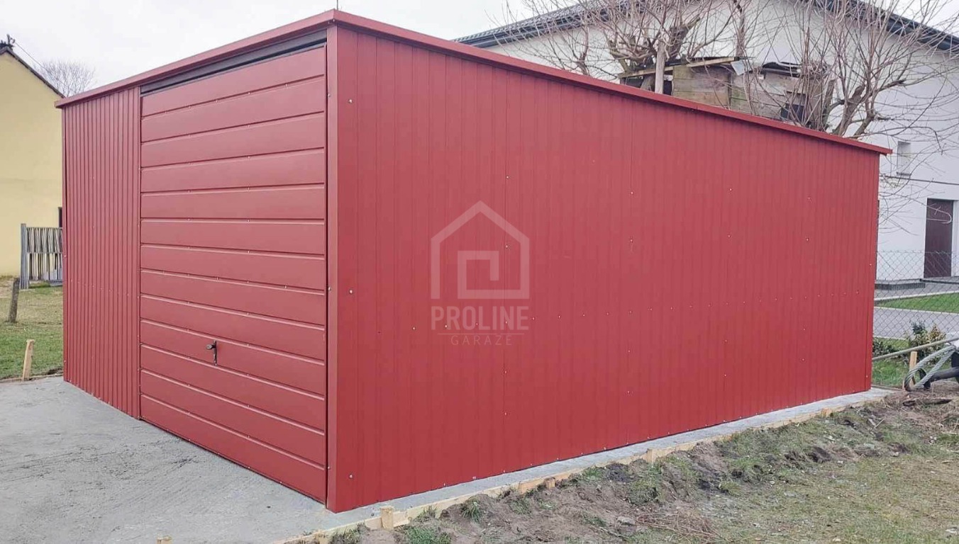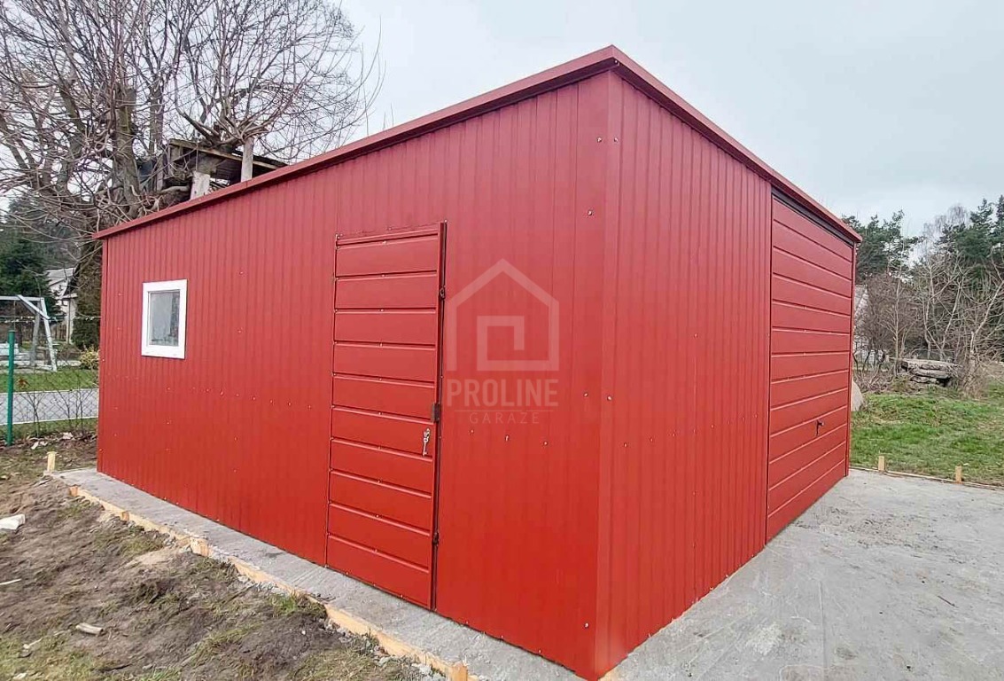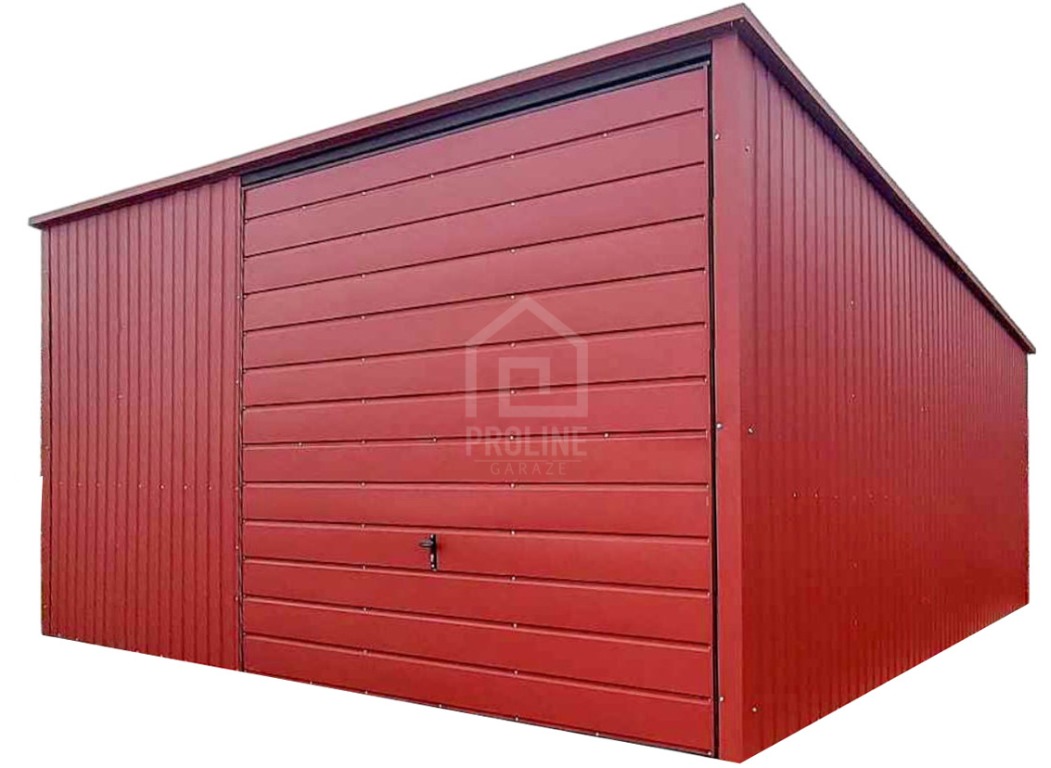 Garaż blaszany 5x6m - brama uchylna - drzwi - okno - czerwony - dach spad w tył PLG254