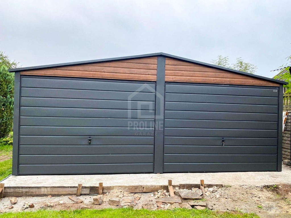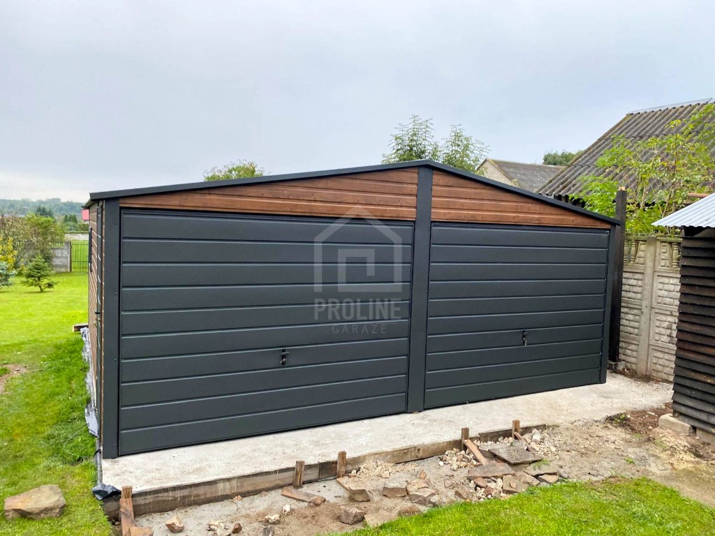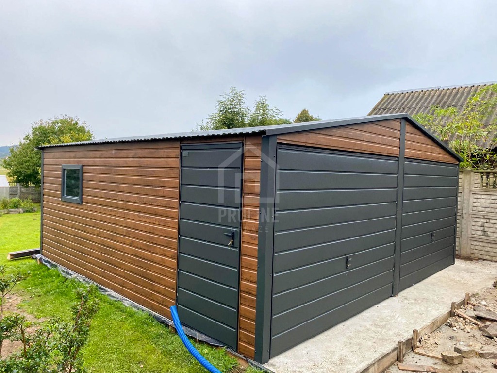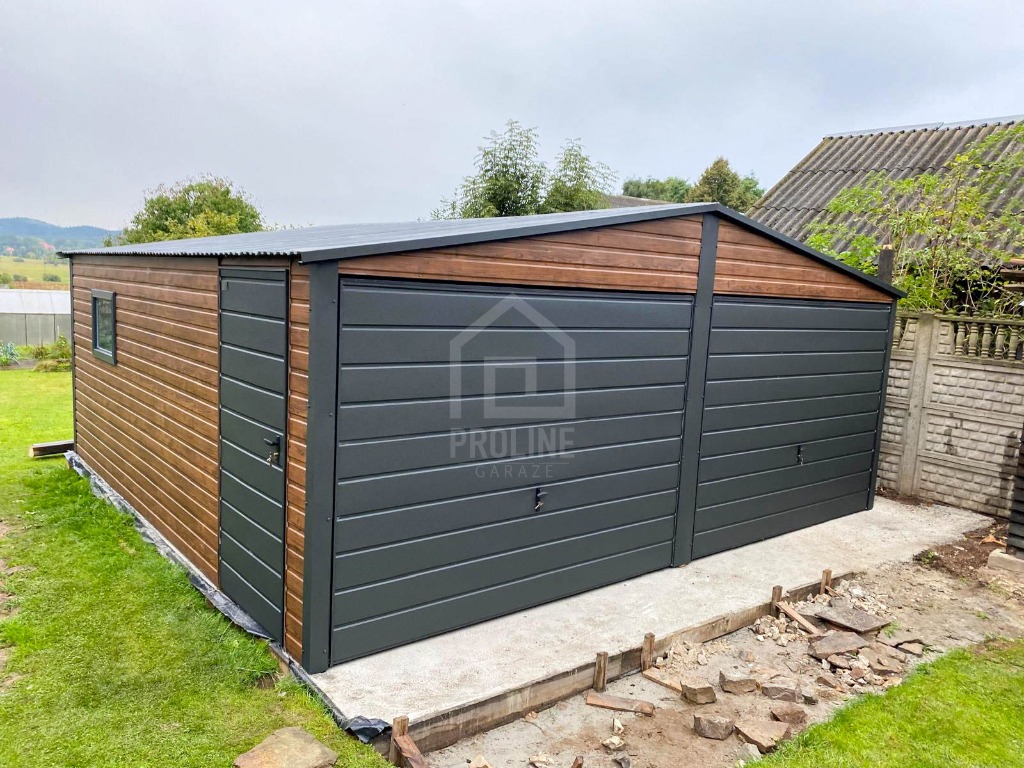 Garaż blaszany 6x5,8 - 2x brama uchylna - drzwi - okno - ciemny orzech - antracyt - drewnopodobny - dach dwuspadowy PLG256