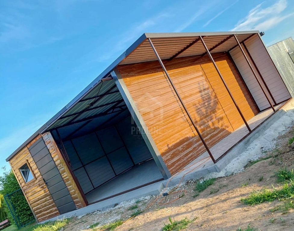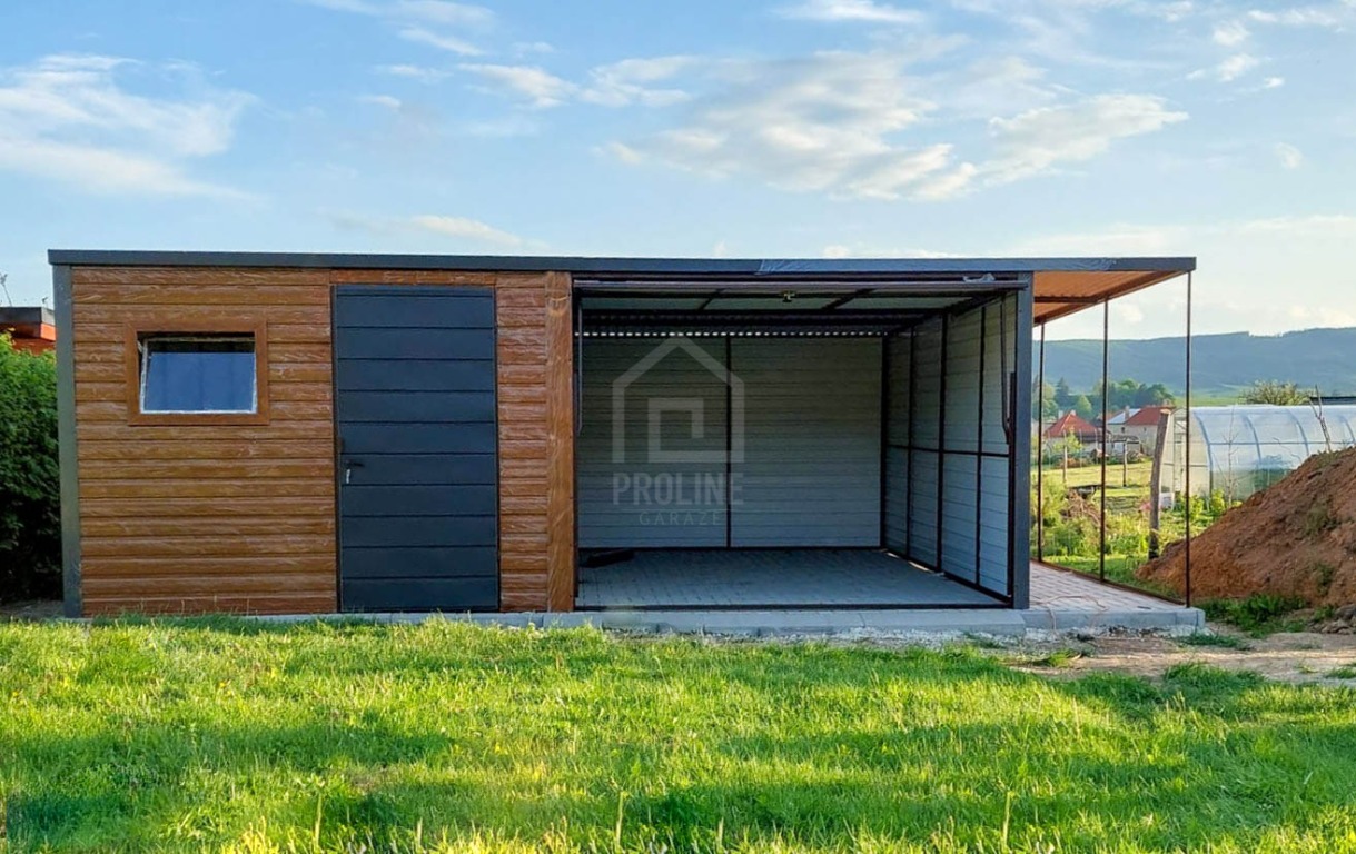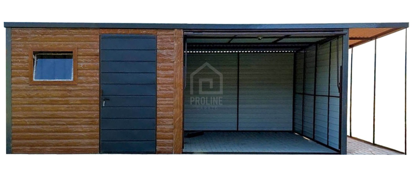 Garaż blaszany 6x5m + wiata 1m - brama uchylna - drzwi - okno - złoty dąb - drewnopodobny - dach spad w tył PLG258