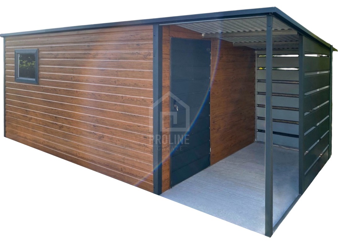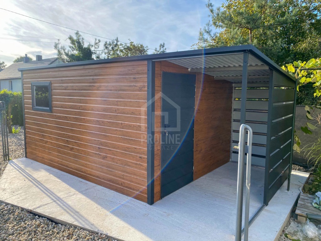 Schowek - Domek ogrodowy 4x2m + wiata 1,5m - drzwi - okno - ciemny orzech - drewnopodobny - antracyt - dach spad w tył PLG261