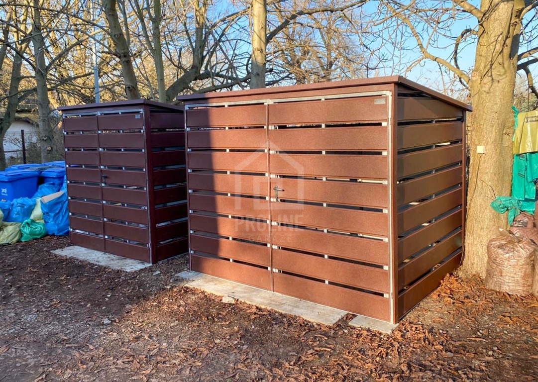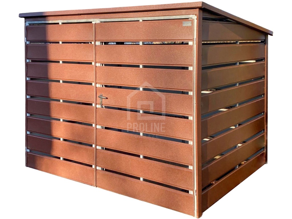 Wiata śmietnikowa 2x1,5m - brama dwuskrzydłowa - ciemny brąz - dach spad w tył PLG263