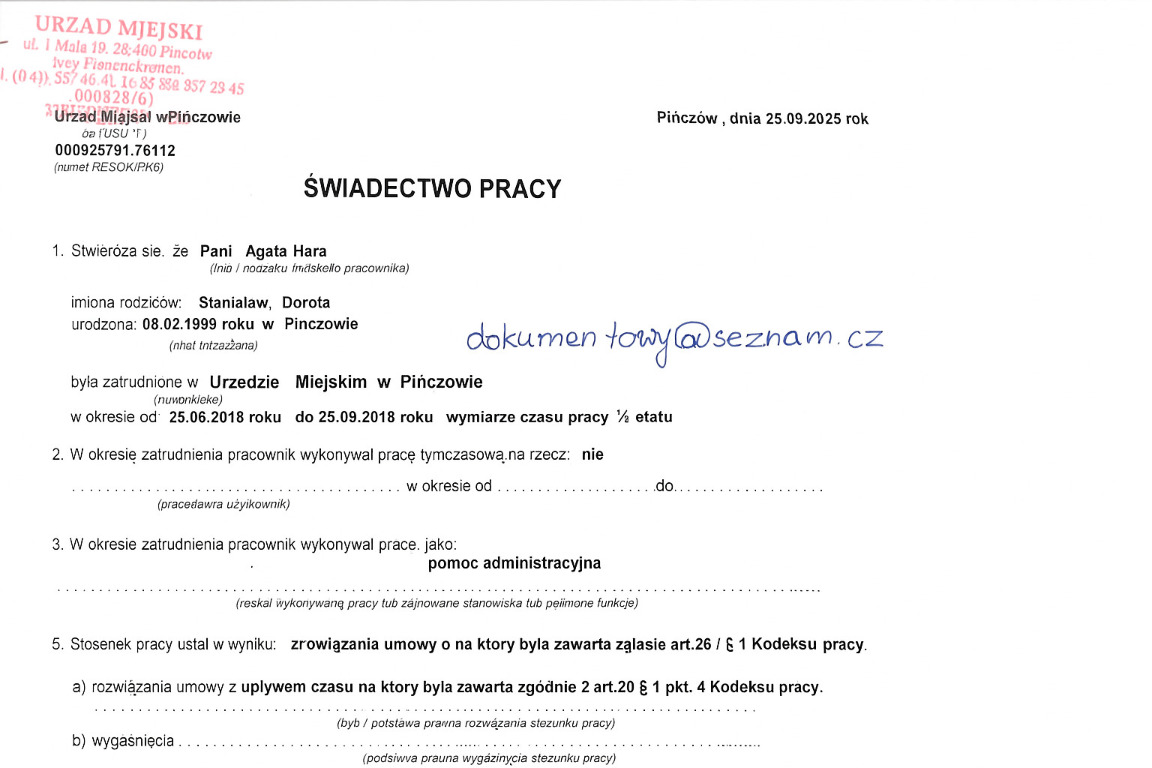 Potwierdzenie zatrudnienia – dla przyszłego pracodawcy, aby zweryfikować doświadczenie zawodowe.