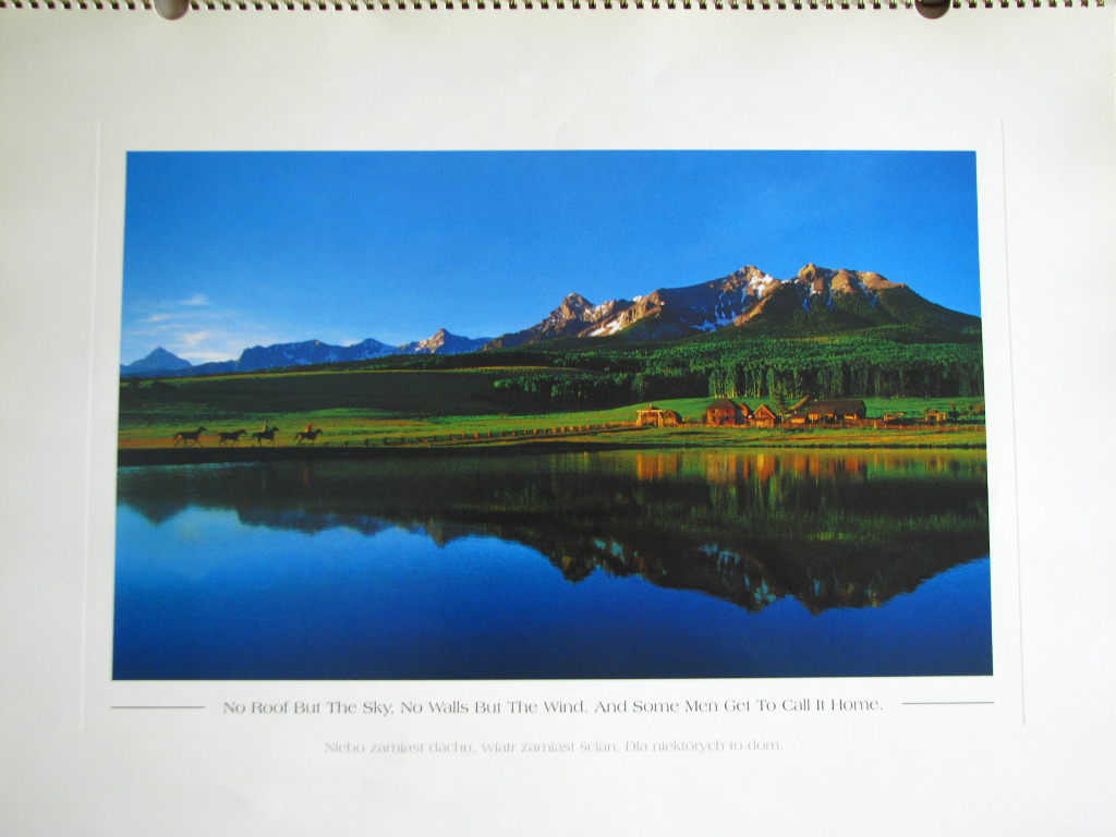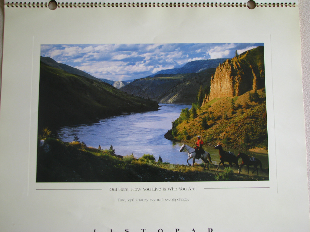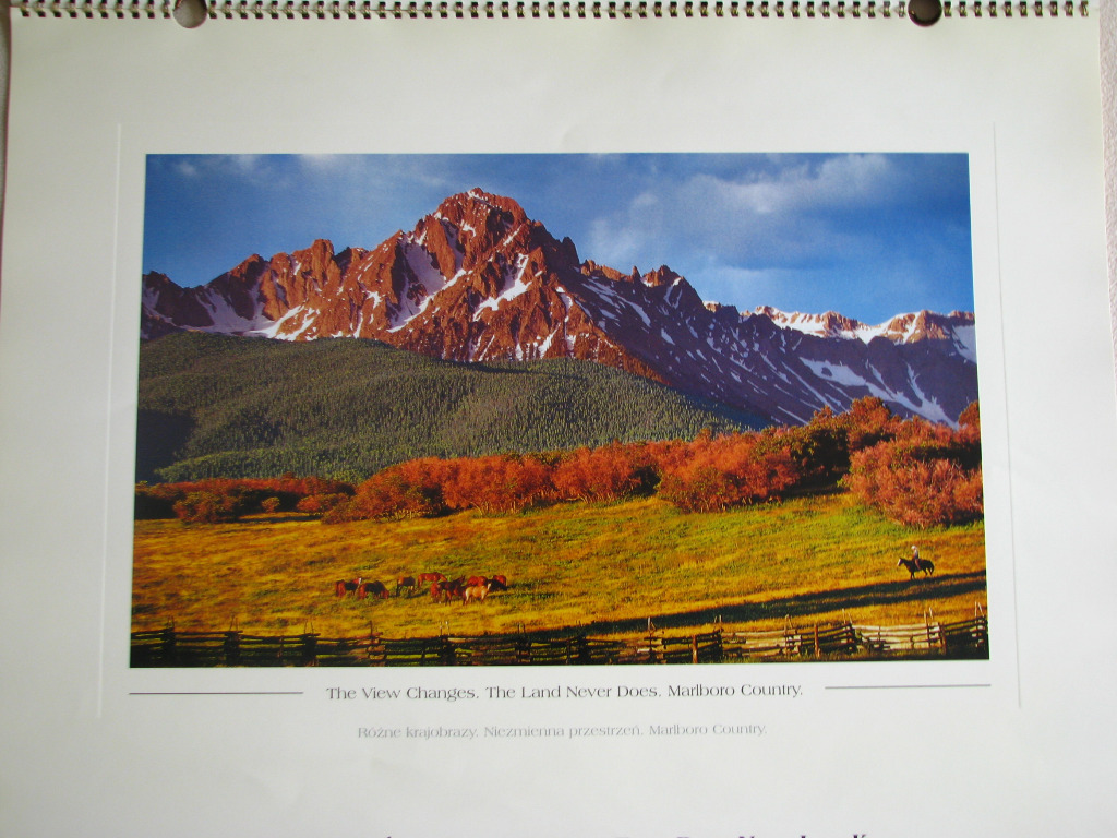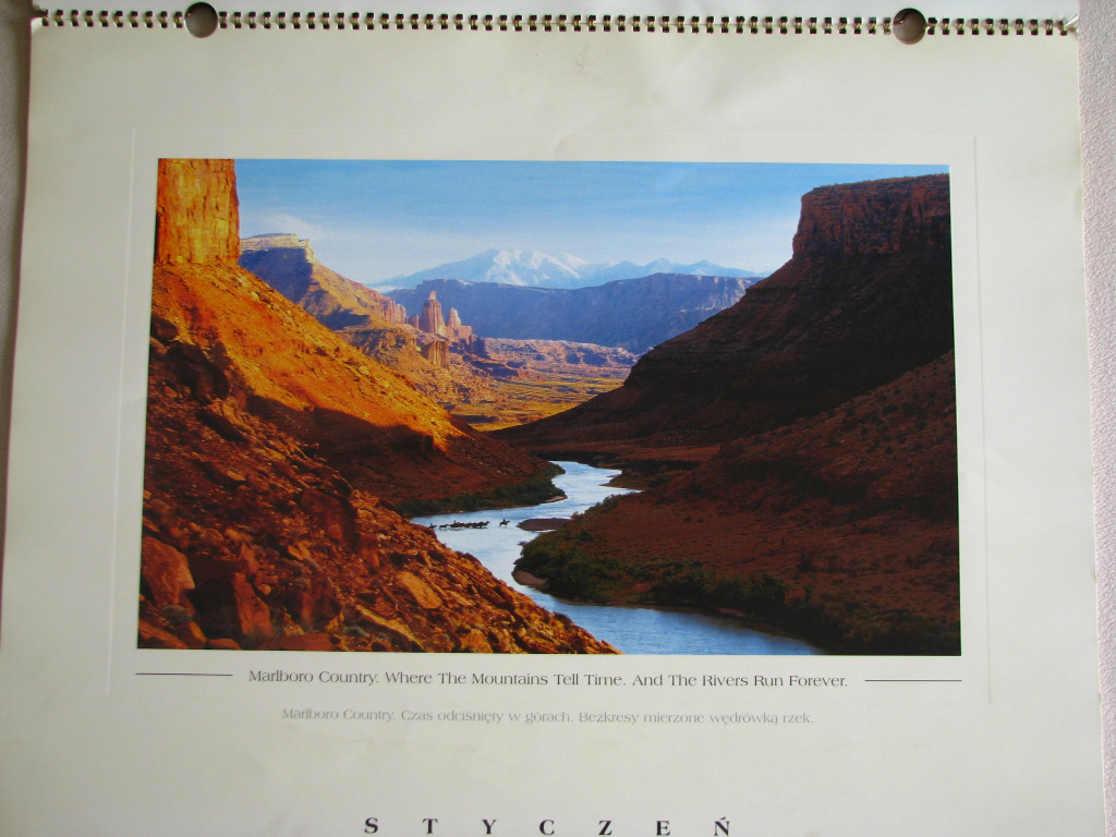Sprzedam kalendarz ścienny Marlboro Country 2001. (Where the mountains tell time and the rivers run forever - MARLBORO COUNTRY – Czas odciśnięty w górach. Bezkresy mierzone wędrówką rzek.)