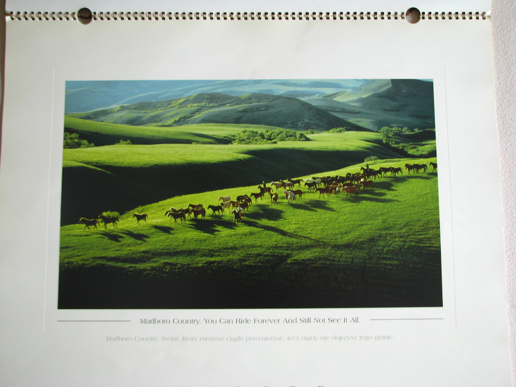 Kalendarz pięknie wydany na twardym, kredowym kartonie. Duże zdjęcia z wytłoczonymi w papierze ramkami przedstawiające kowbojskie życie i konie na tle przepięknych widoków gór, rzek i bezkresnych terenów dzikiej przyrody Marlboro Country.
