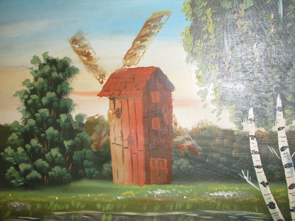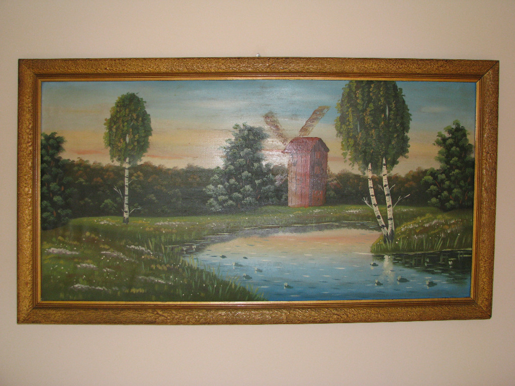 Sprzedam duży, stary obraz olejny, ręcznie malowany na płótnie, przedstawiający pejzaż wiejski z wiatrakiem, o wymiarach 47 cm x 95 cm (z ramą 57 cm x 105 cm).