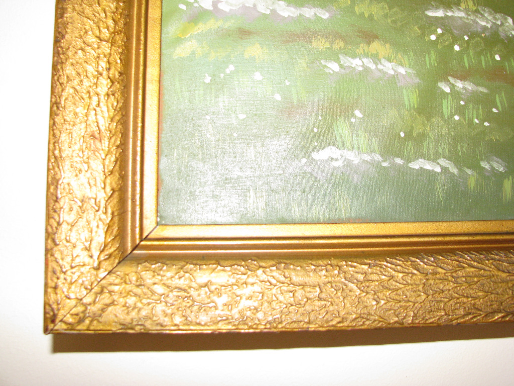 Obraz naciągnięty na drewniany blejtram i oprawiony w ładną, drewnianą ramę w odcieniu ciemnego złota. Widoczna jest technika położenia farby i pociągnięć pędzlem.