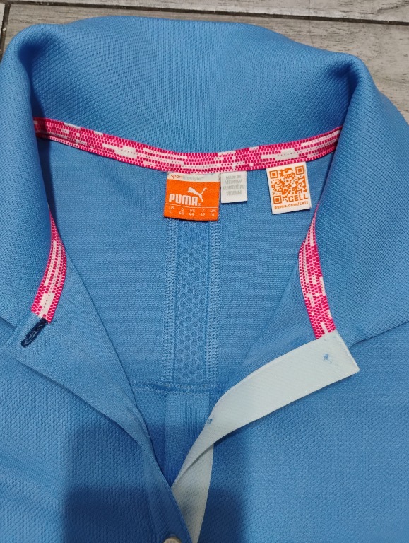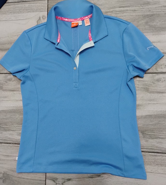 Męski t-shirt marki Puma w kolorze niebieskim, rozmiar L. Z kołnierzykiem. Wymiary: 50/64