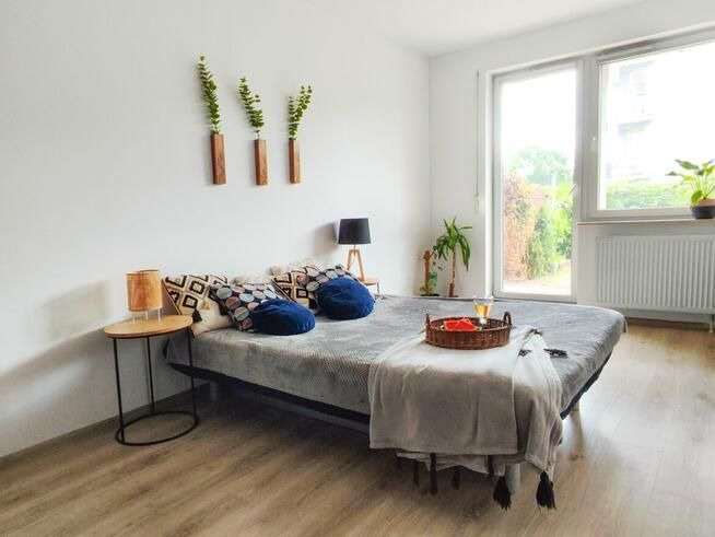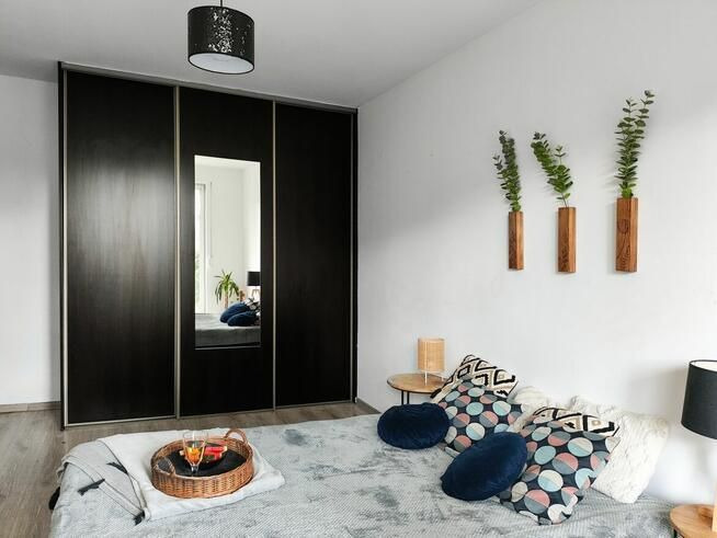 Sypialnia z szafą zabudowaną i wyjściem na ogród,