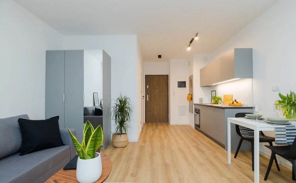 - Kawalerka z aneksem kuchennym, wyposażona w nowoczesne AGD: zmywarka, piekarnik, płyta indukcyjna, okap, lodówka.