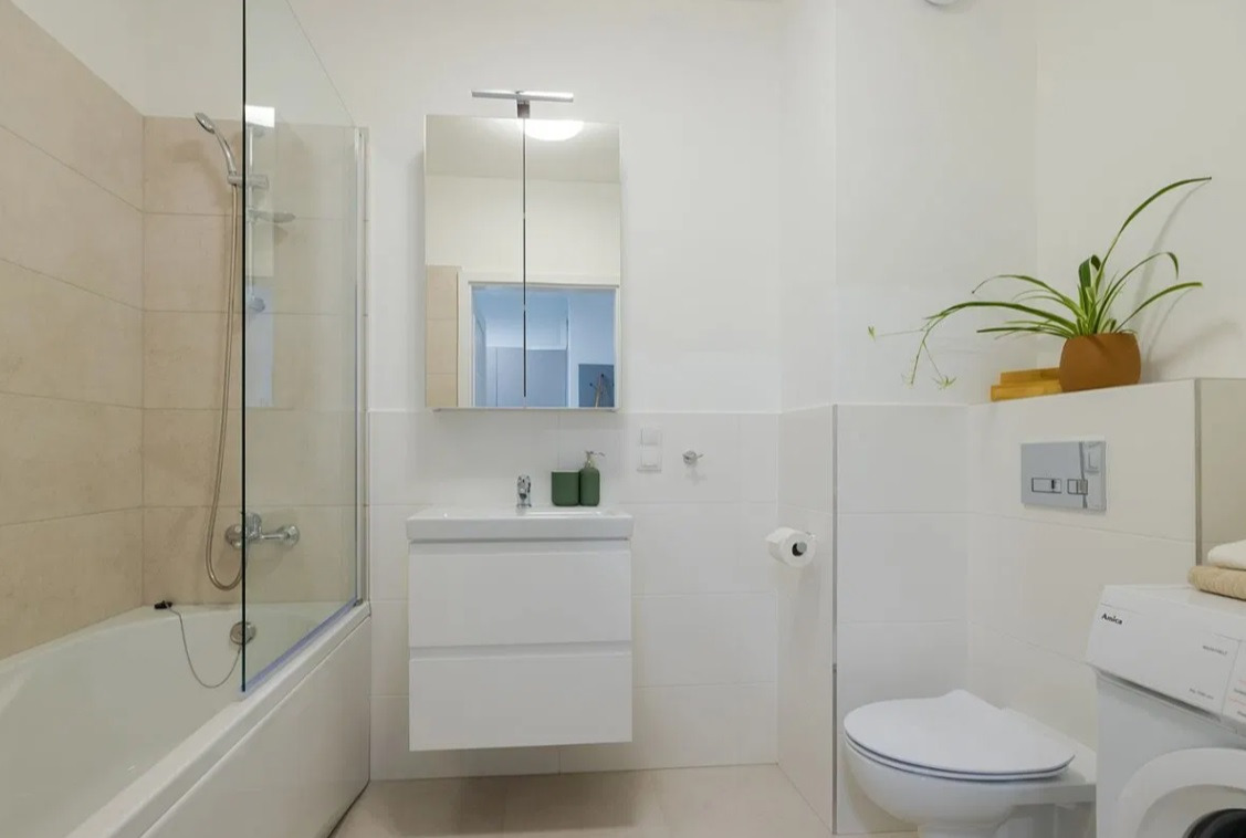 - Łazienka z prysznicem i pralką.