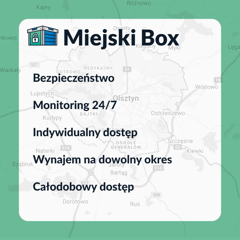 Miejski Box to nowoczesne magazyny do wynajęcia w Olsztynie, stworzone z myślą o wygodnym i bezpiecznym przechowywaniu.