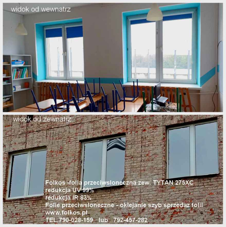 Prostym i szybkim rozwiązaniem jest oklejenie szyb folią przeciwsłoneczną zewnętrzną- folie te bezpośrednio odbijają promienie słoneczne zanim te dotrą do powierzchni szyby. Przez co wykluczają ryzyko pęknięcia szyby na skutek szoku termicznego ( który jest możliwy przy foliach wewnętrznych). Folie te redukują nagrzewanie, ograniczają oślepianie, niwelują efekt blakniecia ( starzenia się mebli, obrazów, podłóg... całych pomieszczeń, dają efekt lustra weneckiego.