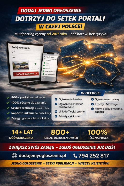 Twoje ogłoszenie publikujemy ręcznie na setkach portali ogłoszeniowych w całej Polsce - bez automatów.