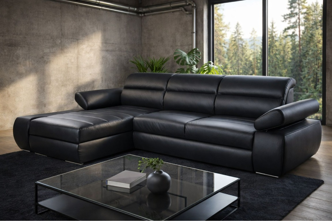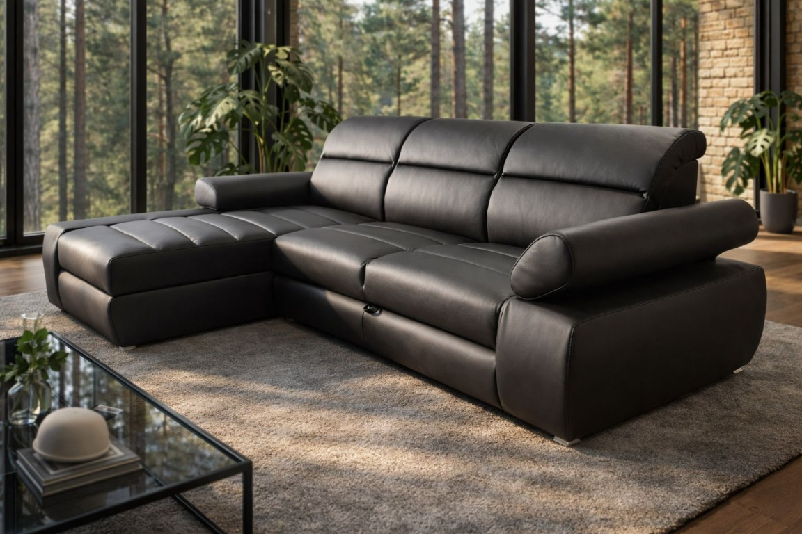 Narożnik Panama ze skóry to nowoczesny narożnik do salonu łączący minimalistyczną formę z funkcjonalnością codziennego użytkowania. Proste linie zostały uzupełnione efektownymi przeszyciami na siedzisku, które nadają bryle wyrazisty charakter. Regulowane boczne podłokietniki pozwalają dopasować komfort i wygląd do indywidualnych potrzeb, a chromowane, metalowe nogi dodają konstrukcji lekkości. Dzięki kompaktowym wymiarom model dobrze sprawdzi się również w mniejszych salonach. Narożnik wyposażony jest w funkcję spania wózkową do codziennego użytkowania oraz pojemnik na pościel w standardzie. Tył narożnika wykonany jest w skórze – w cenie.