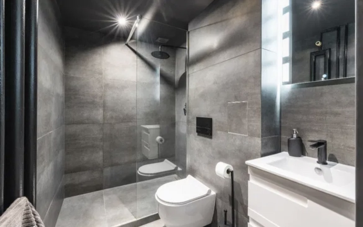 Nowoczesna łazienka z prysznicem typu walk-in, wykończona eleganckimi, szarymi płytkami. Przestrzeń jest dobrze oświetlona, a designerskie detale, takie jak czarne baterie i akcesoria, dodają jej wyjątkowego charakteru. Duże lustro nad umywalką optycznie powiększa przestrzeń, czyniąc ją jeszcze bardziej komfortową.