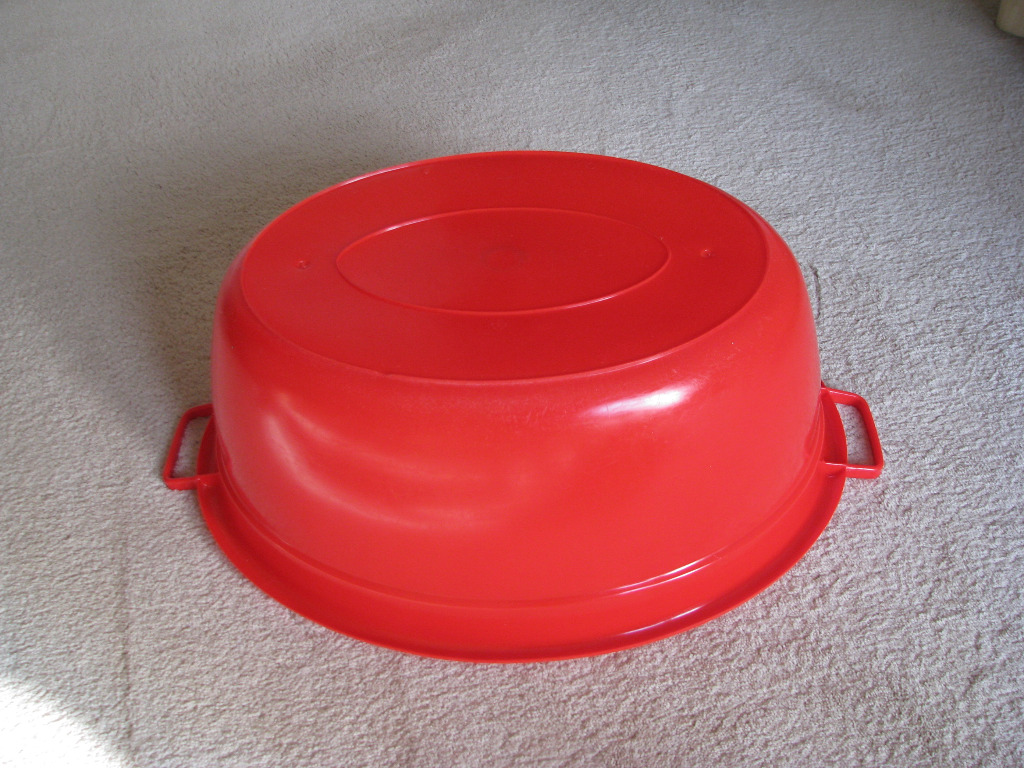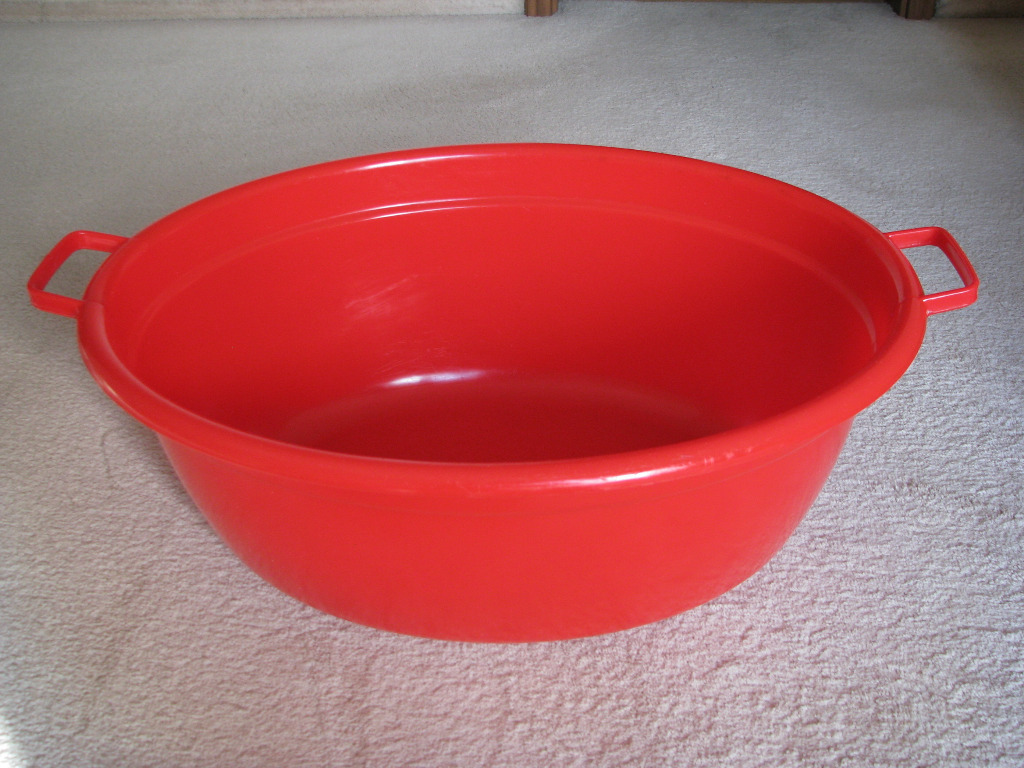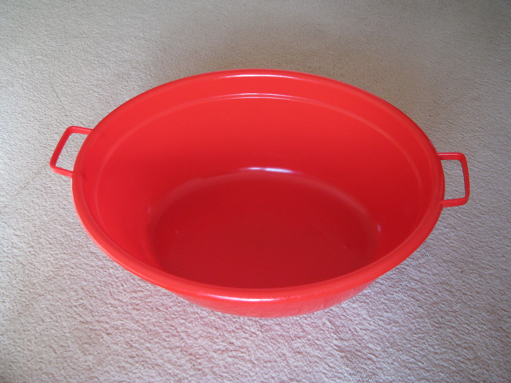 Sprzedam dużą owalną miskę – wanienkę o pojemności 60 litrów w czerwonym kolorze.