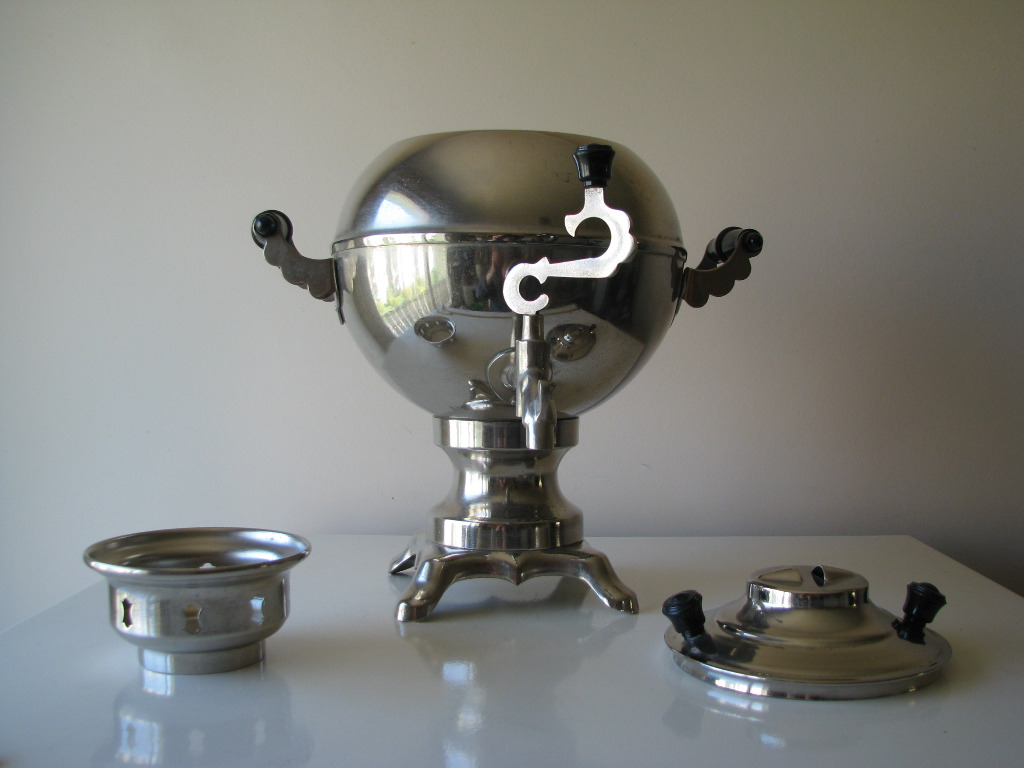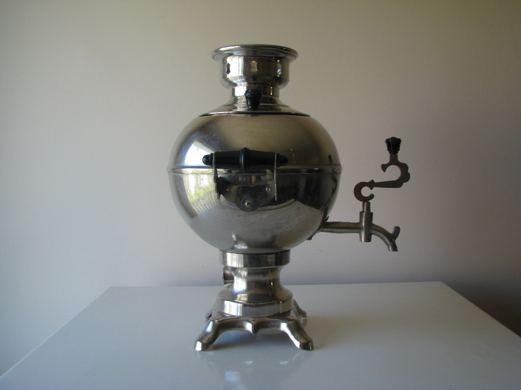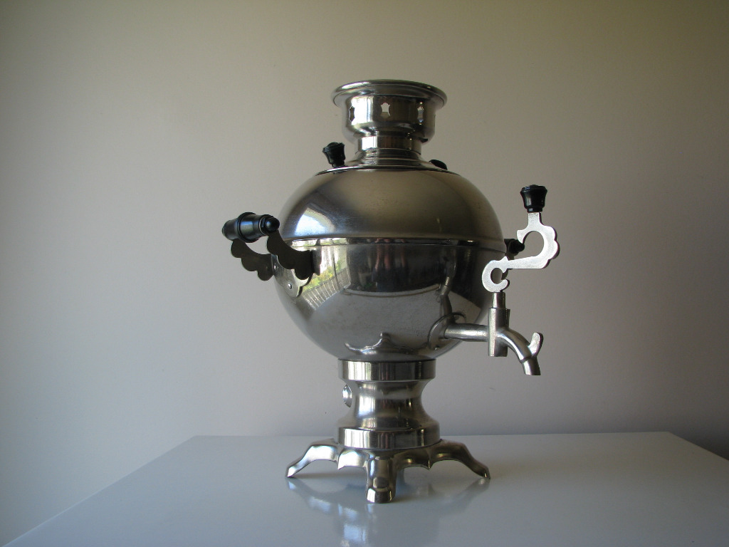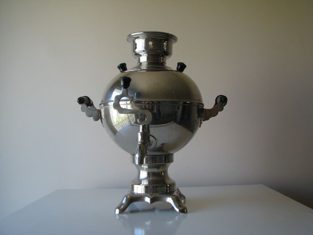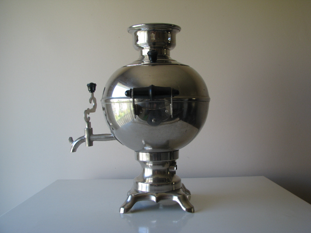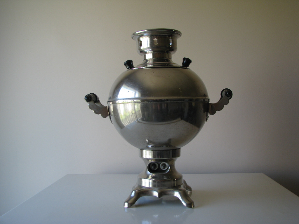 Piękny, stary radziecki samowar o ciekawym, kulistym kształcie posiada klasyczną konstrukcję: składa się ze zbiornika na wodę, wewnątrz którego umieszczona jest grzałka elektryczna.