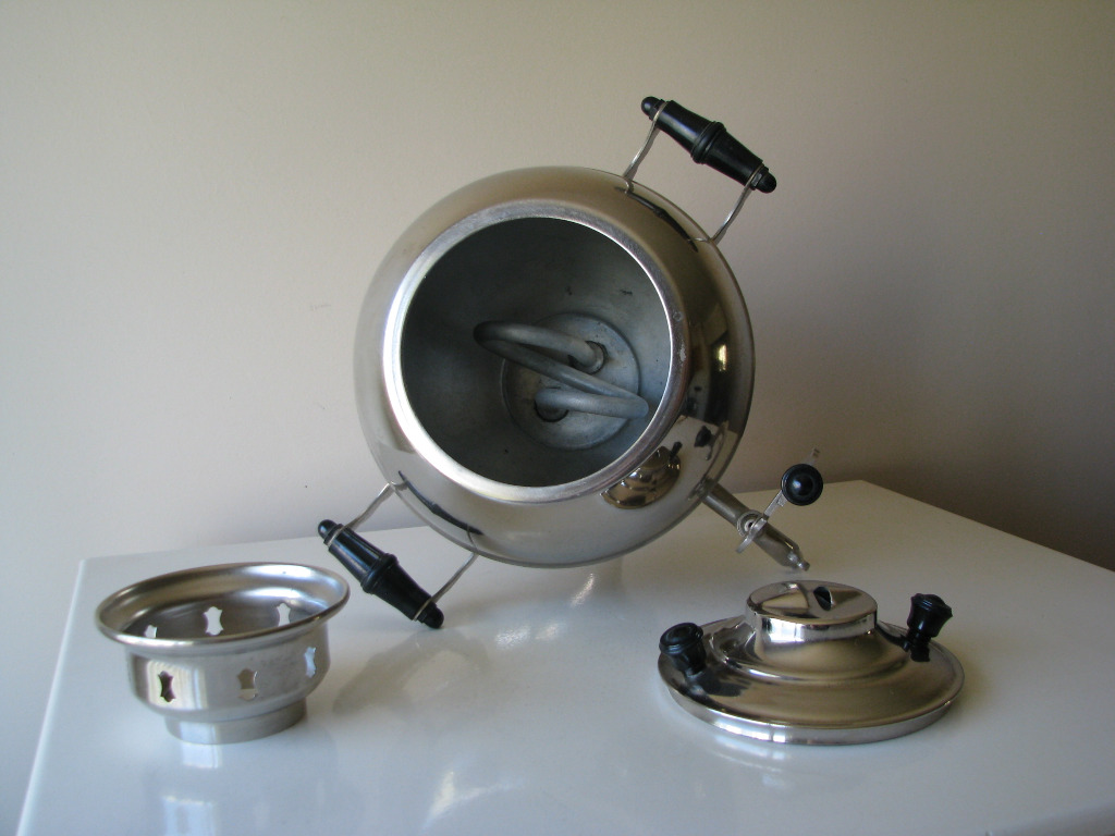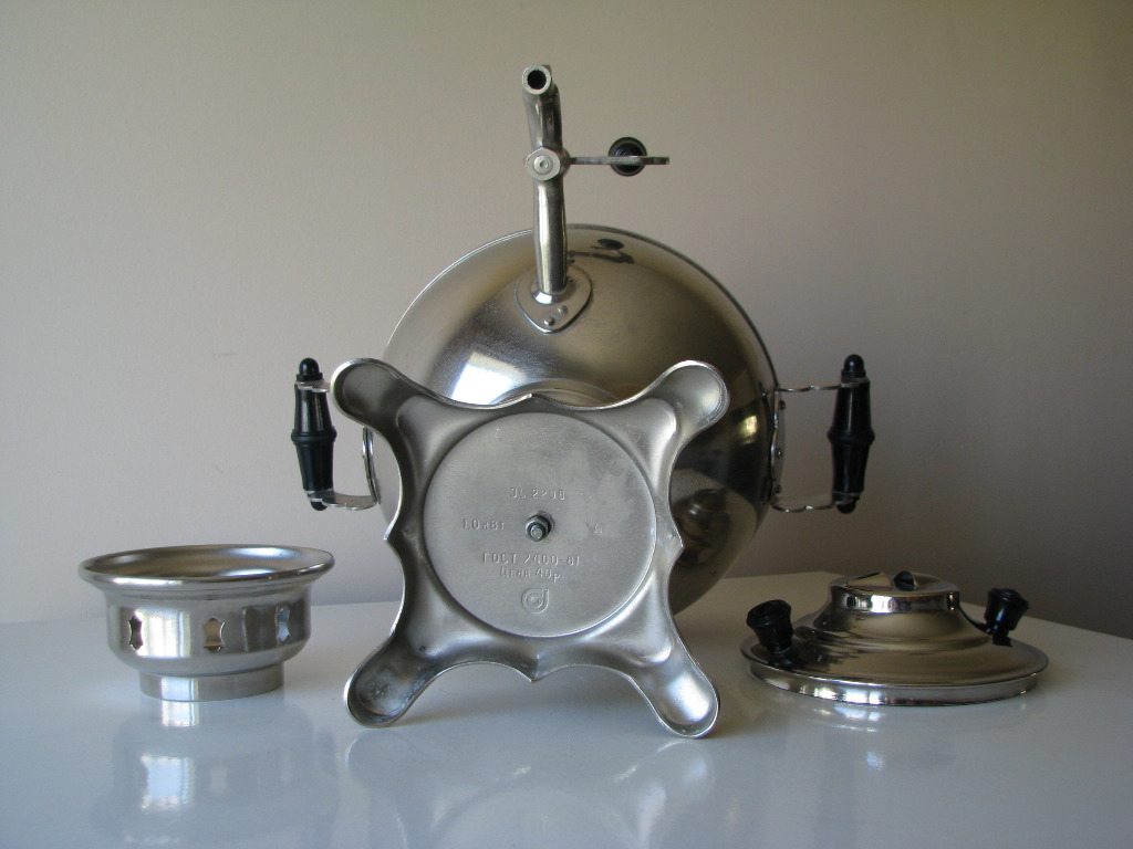Otwór zbiornika zamykany jest pokrywką wyposażoną w małe otwory, które umożliwiają ujście powstającej pary wodnej, jednocześnie ogrzewając esencję herbaty w czajniczku, umiejscowionym na koronie nad pokrywką.